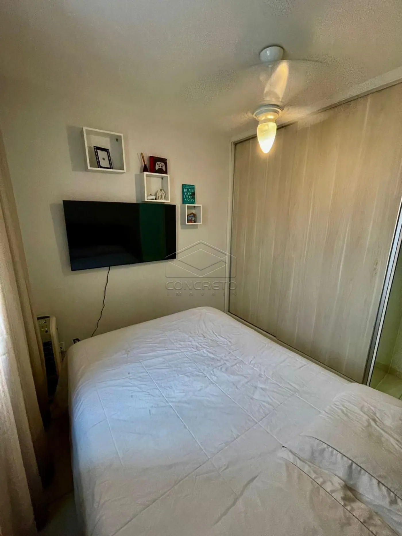 Quarto 1: Dormitório espaçoso, com armário planejado para otimização de espaço, cama de casal confortável e ventilador de teto, garantindo uma boa circulação de ar.