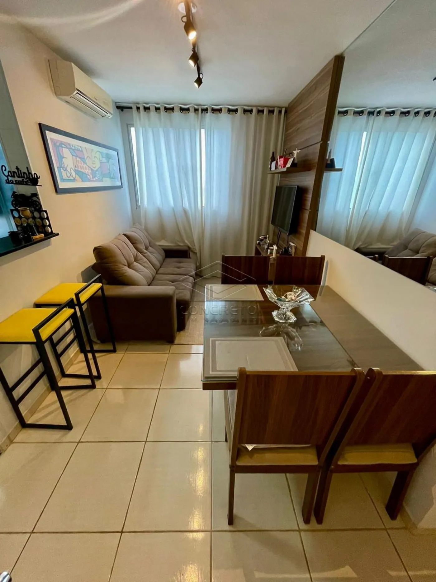 Sala de Estar: Ampla, com painel de TV equipado com uma TV de última geração, sofá confortável de 3 lugares, mesa de madeira com 4 cadeiras e ar-condicionado para garantir conforto térmico em todas as estações.