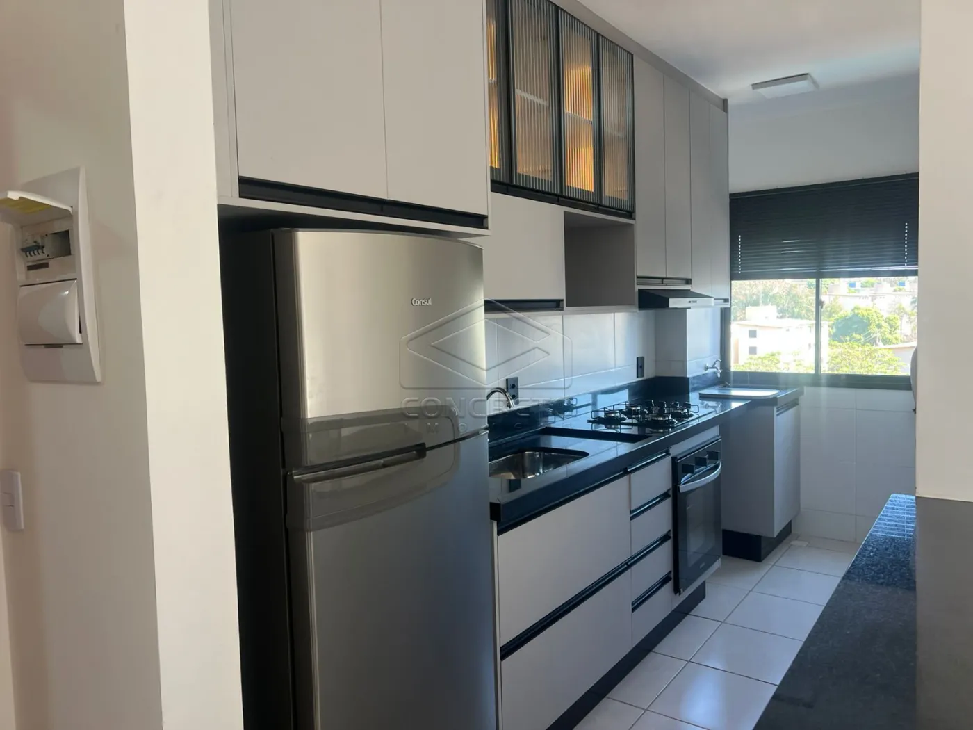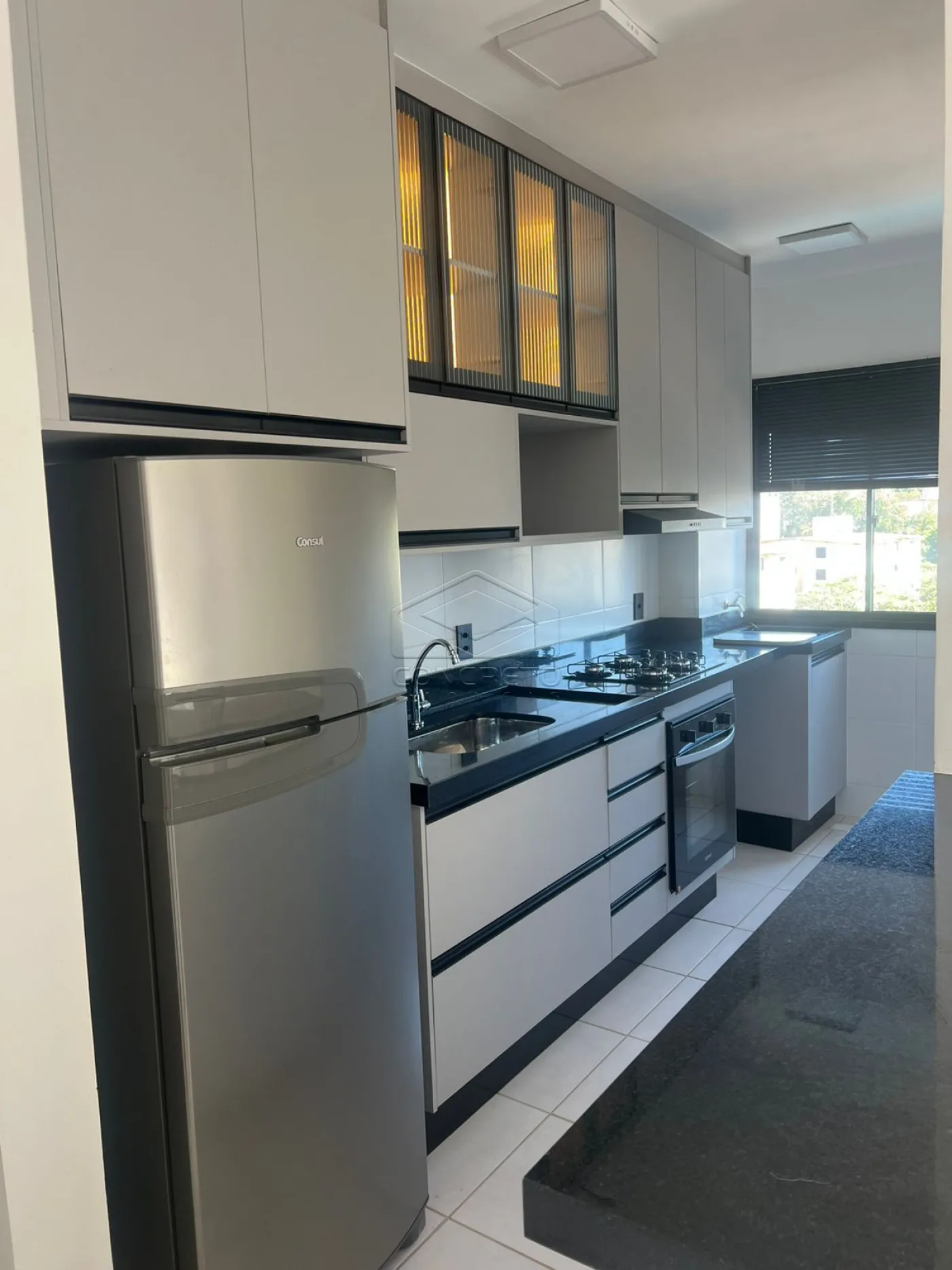 Lindo apartamento completo em armários, cozinha com cooketop forno e geladeira.