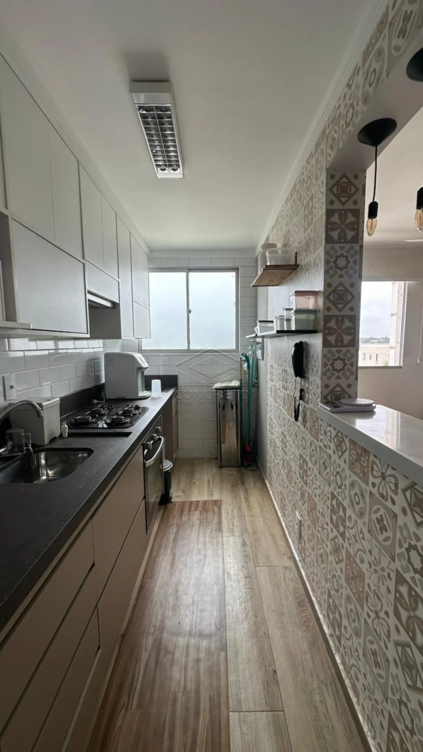 A cozinha com lavanderia integrada garante praticidade nas tarefas diárias. São 2 dormitórios, sendo um com cama de casal e o outro com guarda-roupas, além de banheiro social bem distribuído.
