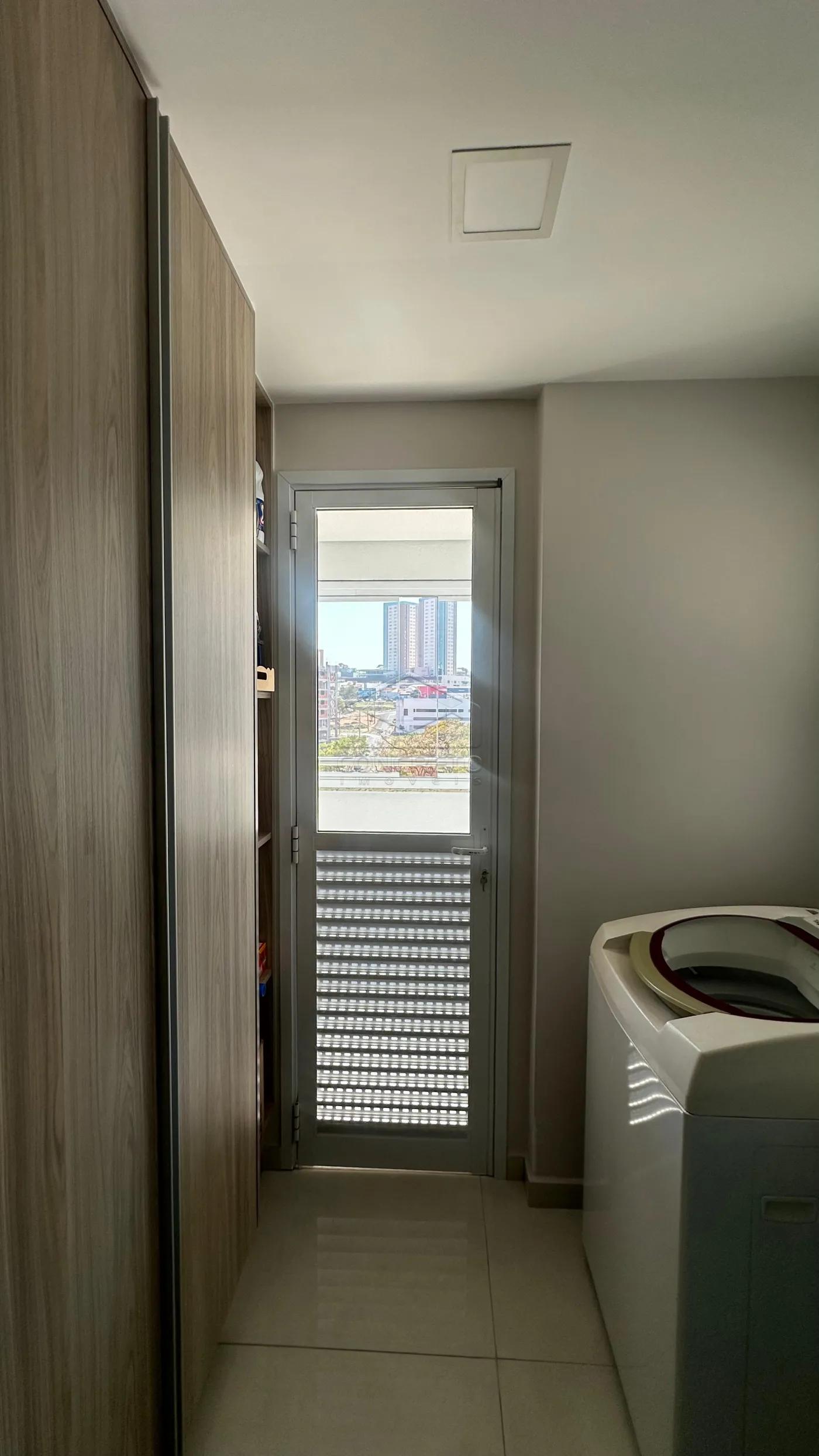 A cozinha é funcional e também equipada com armários, integrada à lavanderia, oferecendo mais organização. Além disso, dispõe de banheiro social para maior comodidade.