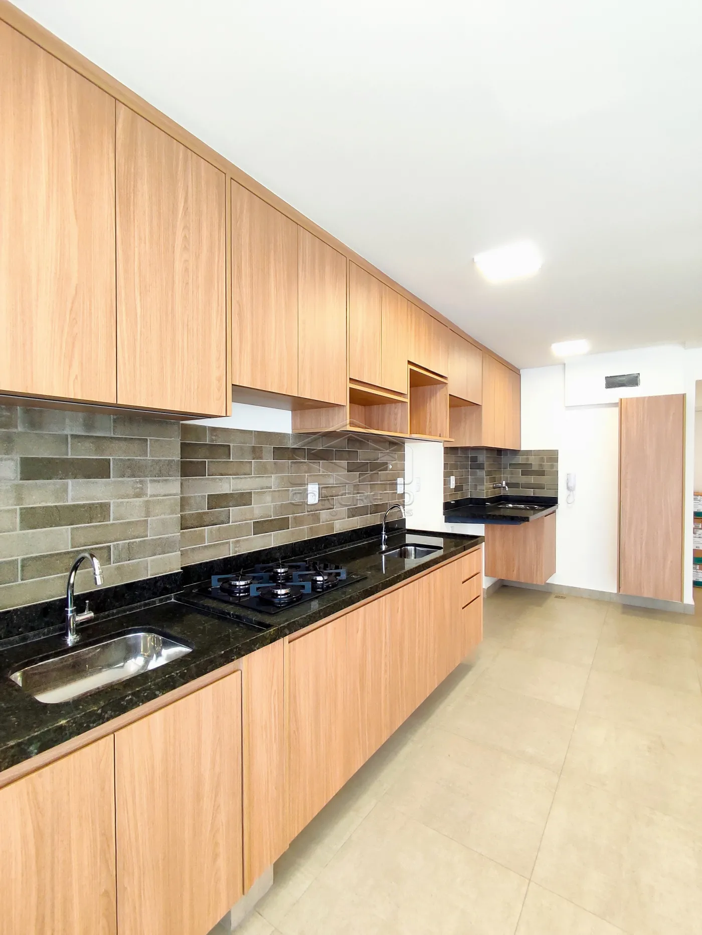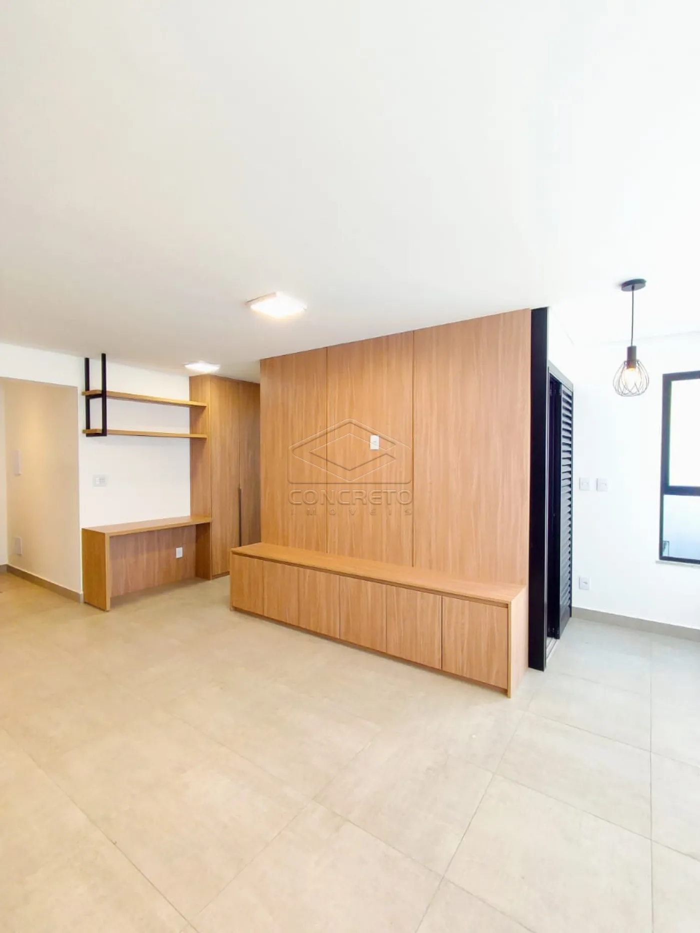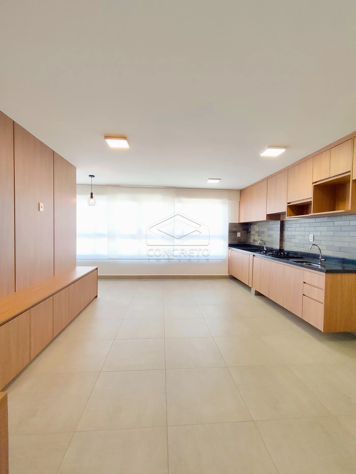 O imóvel conta com sala e cozinha integradas em conceito aberto, proporcionando amplitude, luminosidade e um ambiente moderno e funcional. A cozinha está equipada com cooktop e armários planejados de qualidade, enquanto a sala possui um elegante painel de TV.