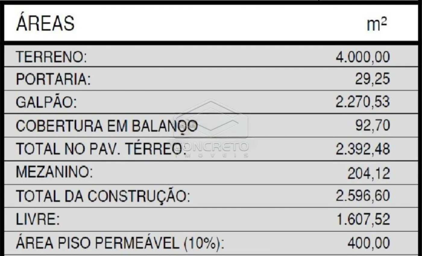 O imóvel possui 4.000 m² de área de terreno e 2.600 m² de área construída, oferecendo amplo espaço para armazenagem, movimentação e operação.