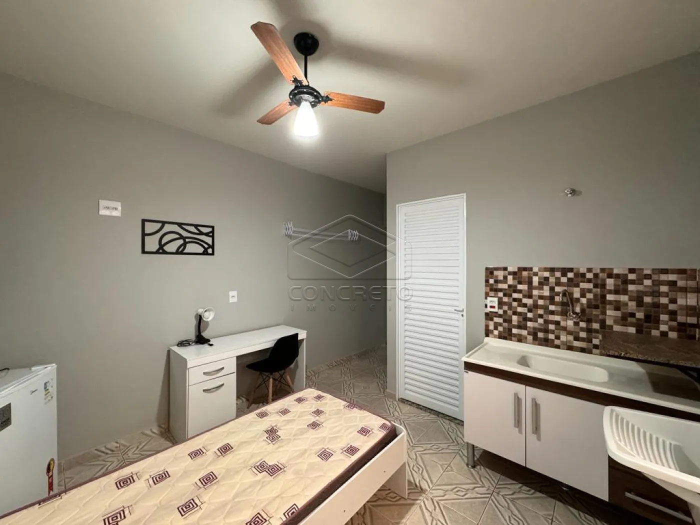 Kitnet mobiliada possui: guarda roupa, cama, mesa para estudo, cozinha com gabinete, frigobar, fogão, tanque e ventilador de teto.