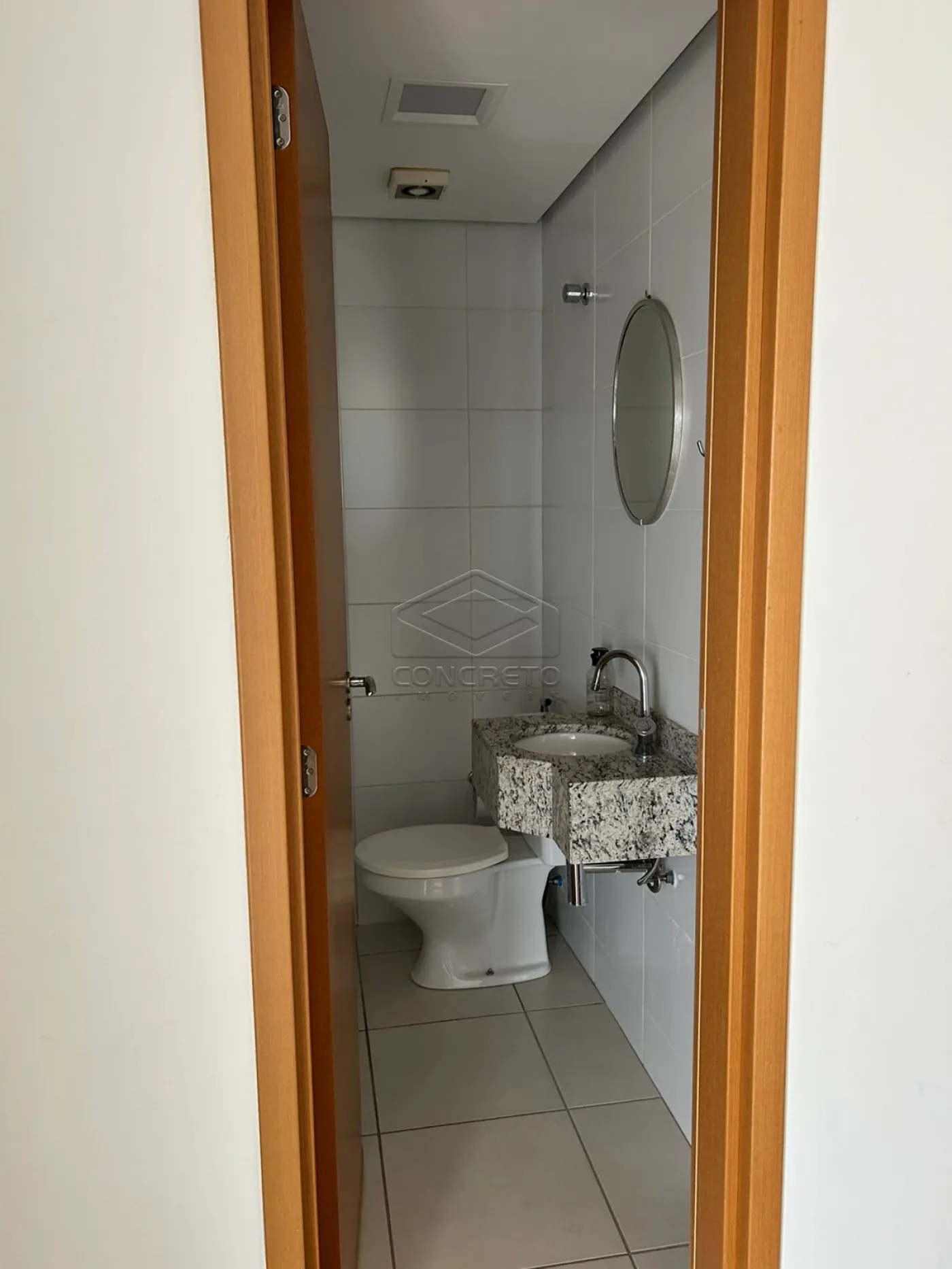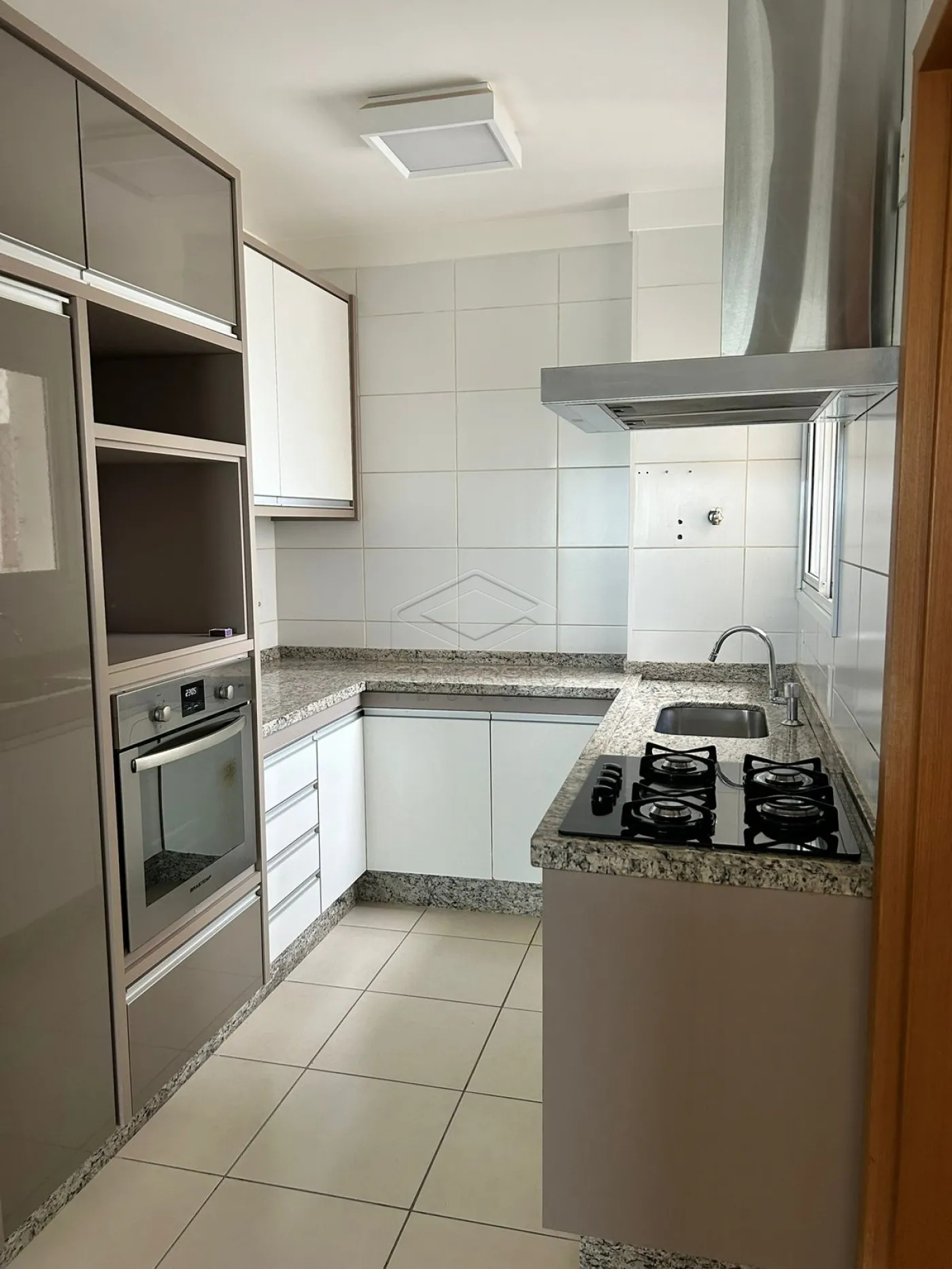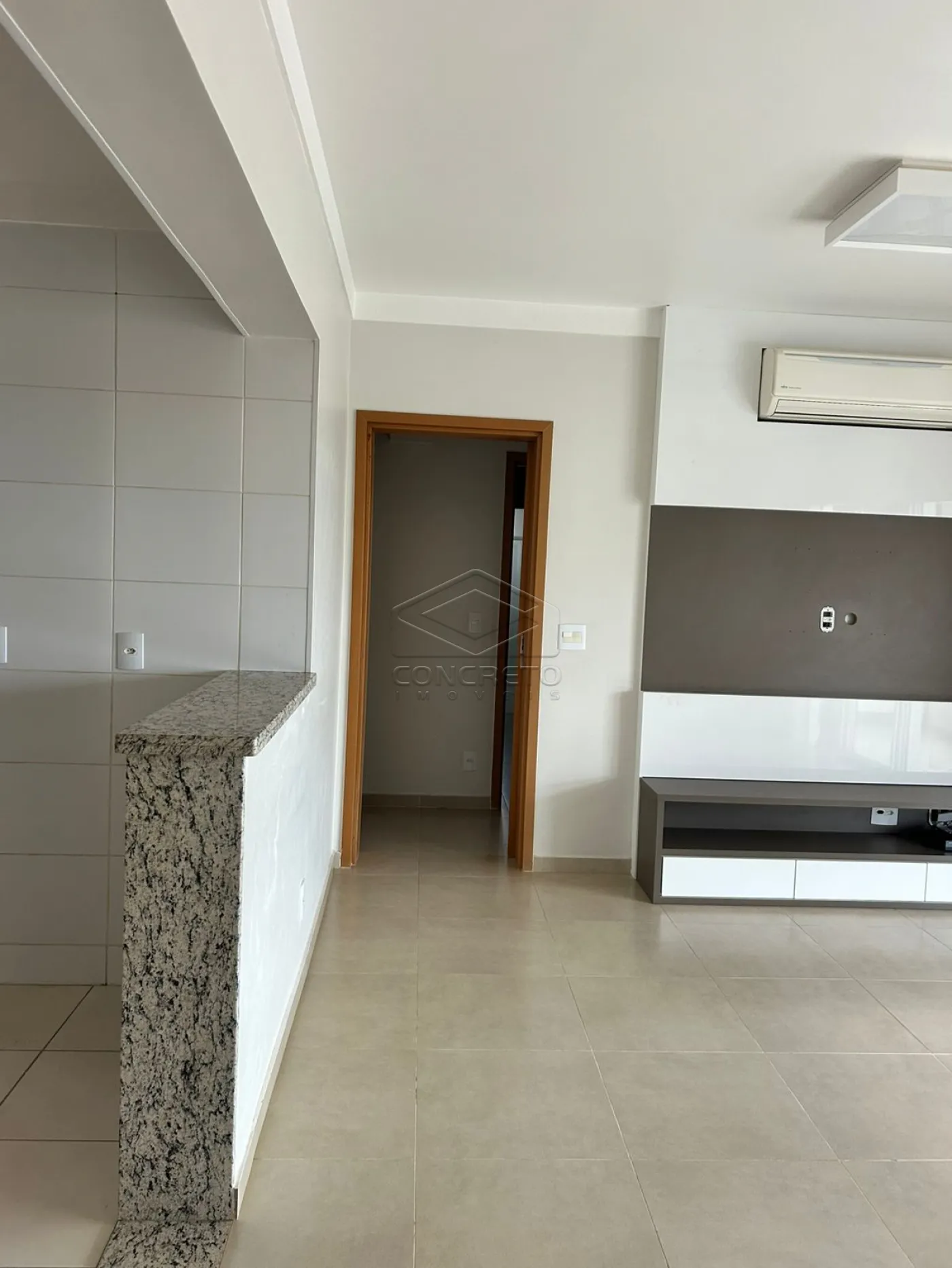 Sala com ar condicionado, sala de jantar, lavabo, cozinha completa em armários, cooktop e forno elétrico.