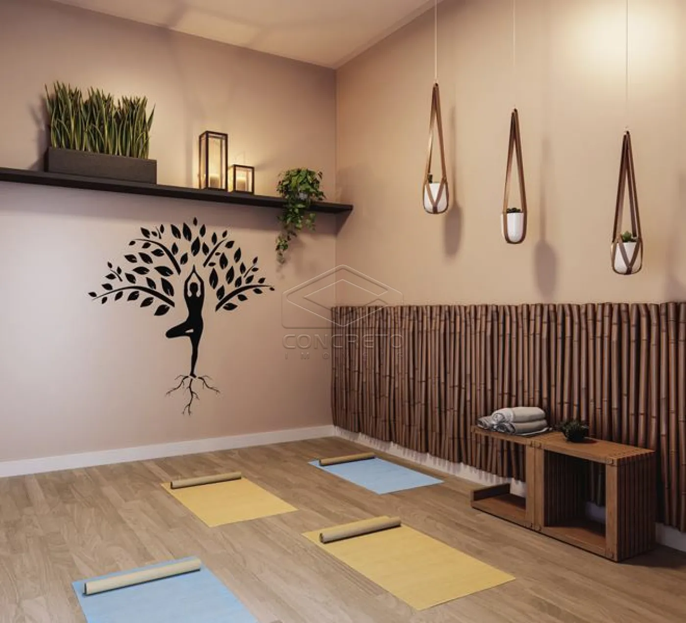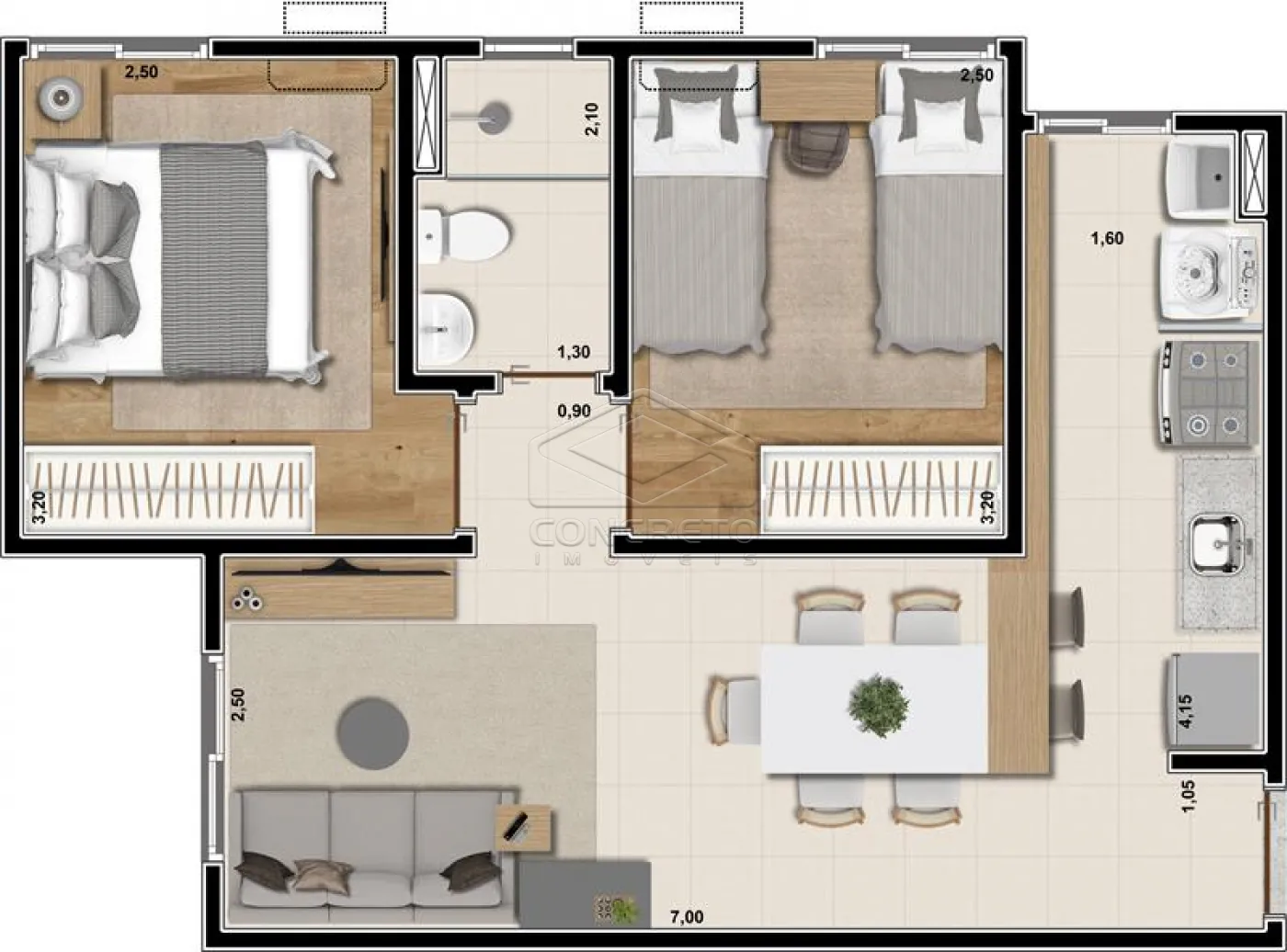 2 dormitórios com sol da manhã, sendo que um deles com ar condicionado LG Dual Inverter Smart + IA voz de 9000 Btus e luz smart, para noites tranquilas e personalizadas