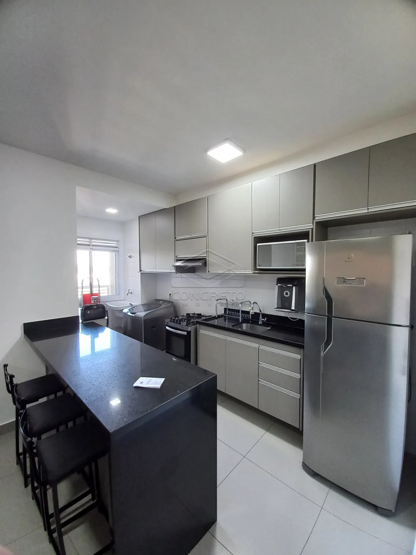 -Cozinha com armários planejados, bancada, geladeira e fogão