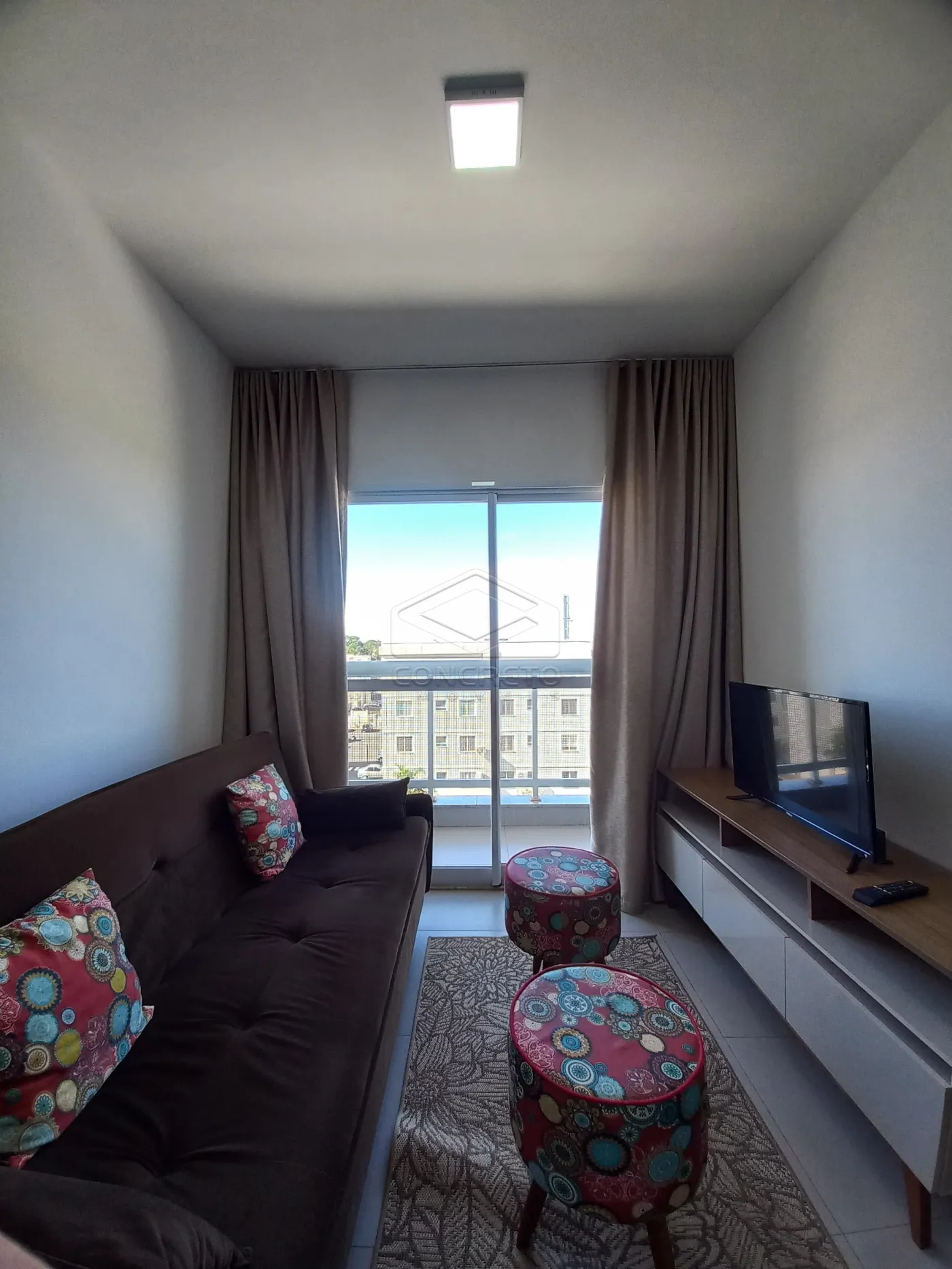 -Sala com sofá, estante, cortina blackout e varanda
