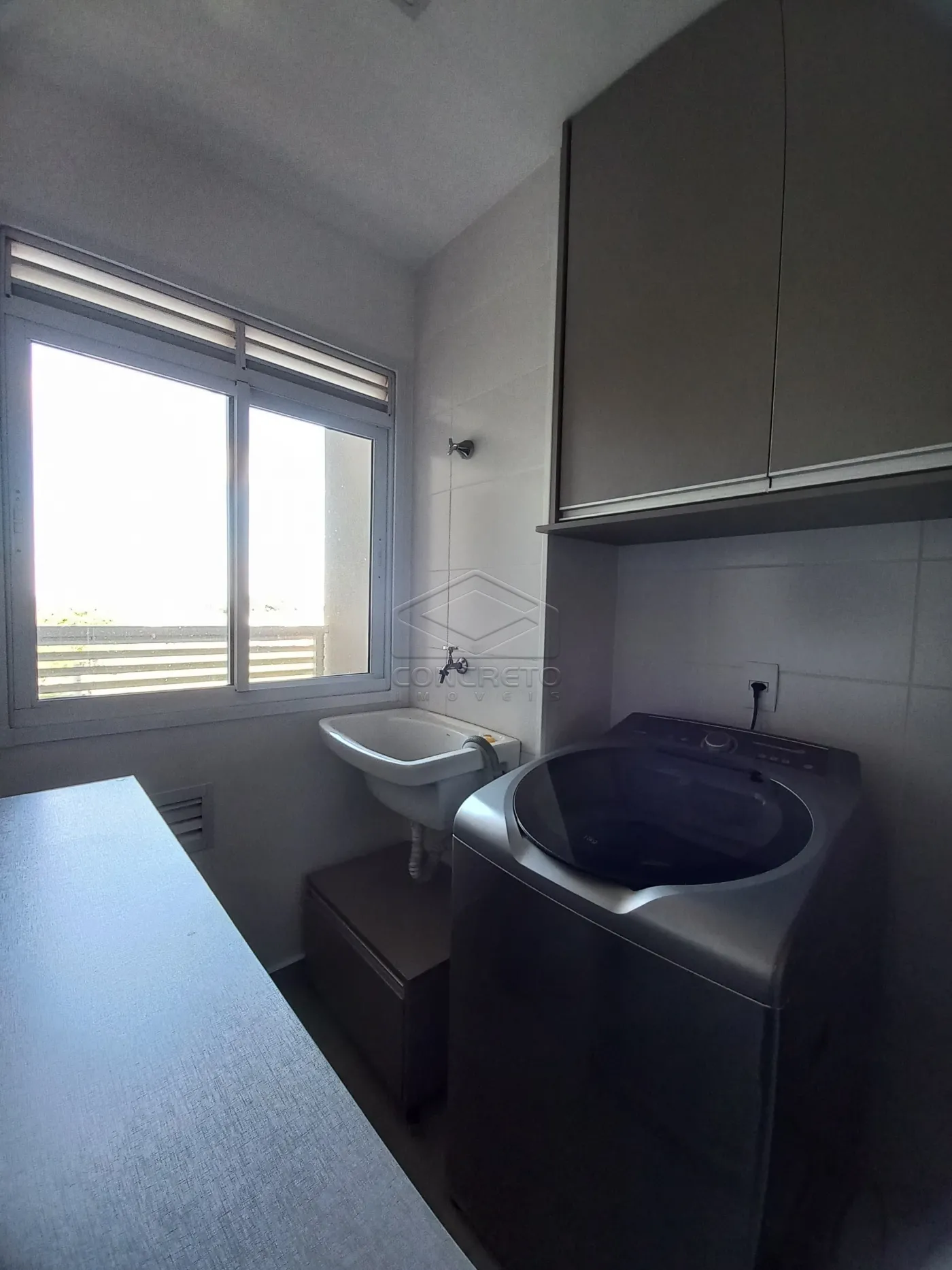 -Área de serviço com tanque, armários e máquina de lavar