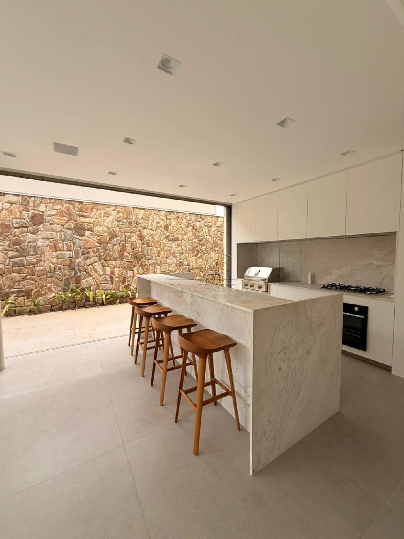 Sistema sonoro com caixas embutidas JBL na cozinha gourmet, persianas automatizadas, completa em armários;