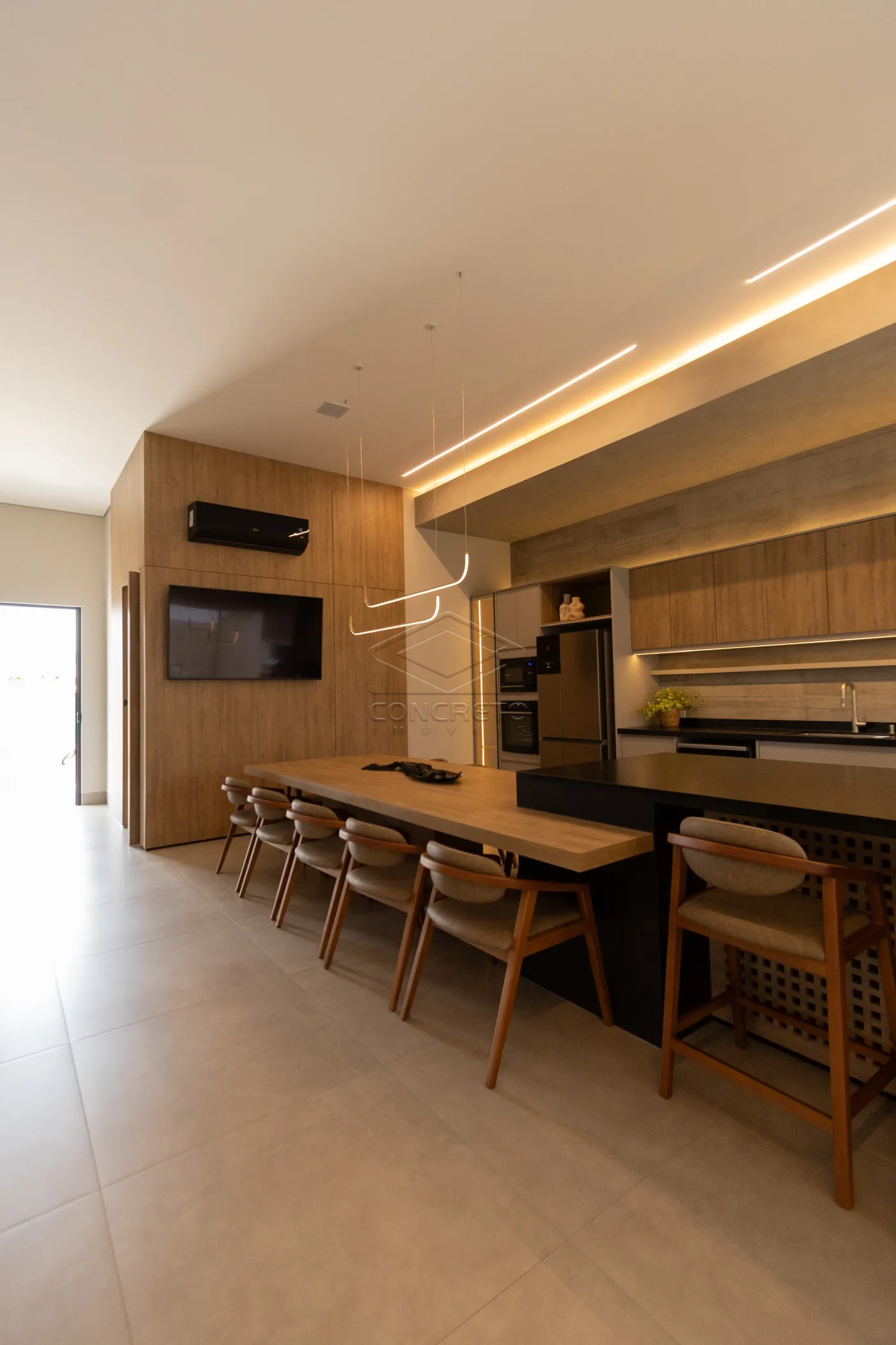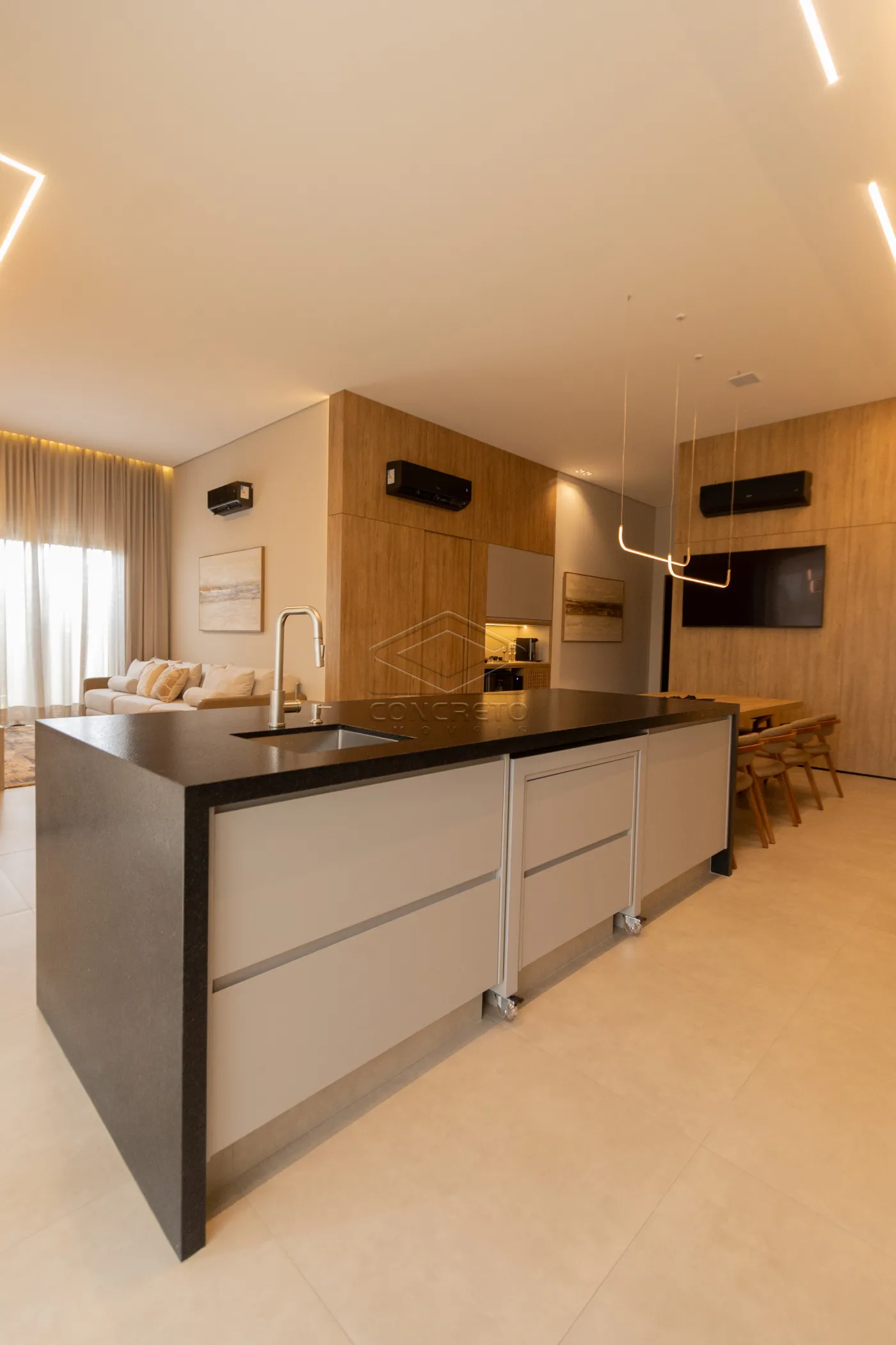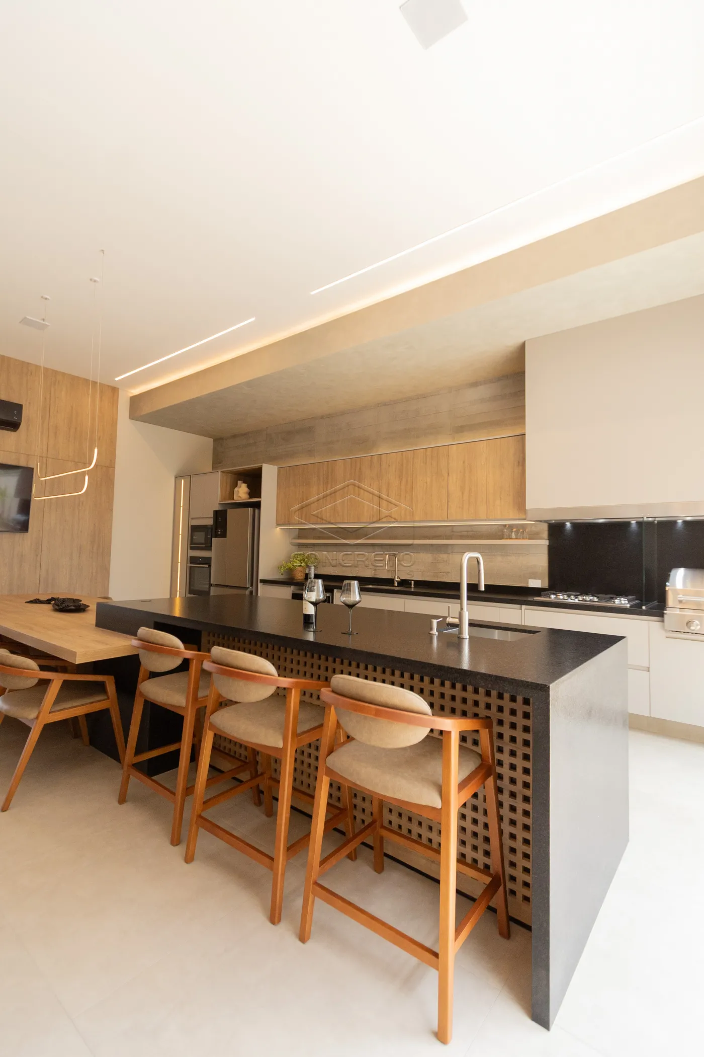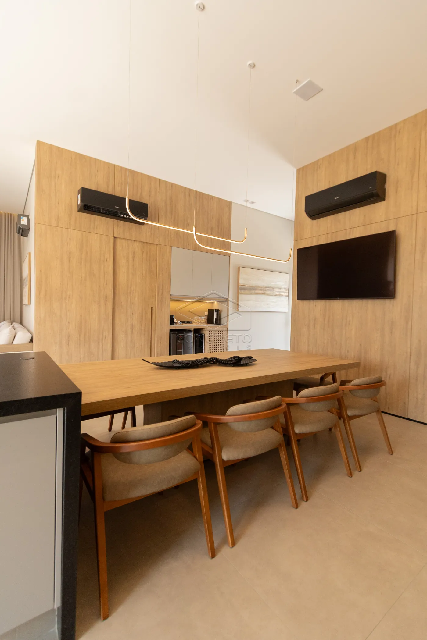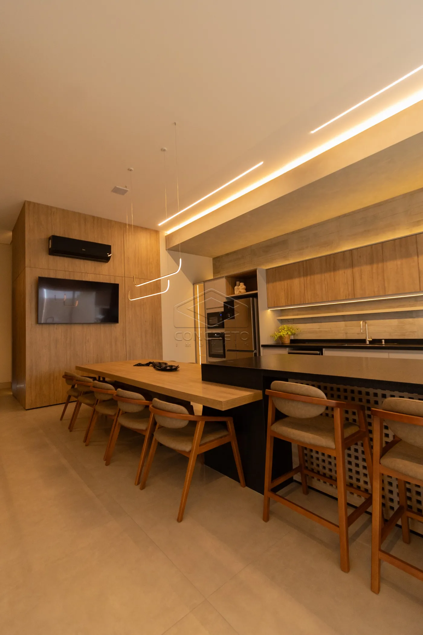 Sala de TV integrada ao espaço gourmet, com possibilidade de fechamento em marcenaria;