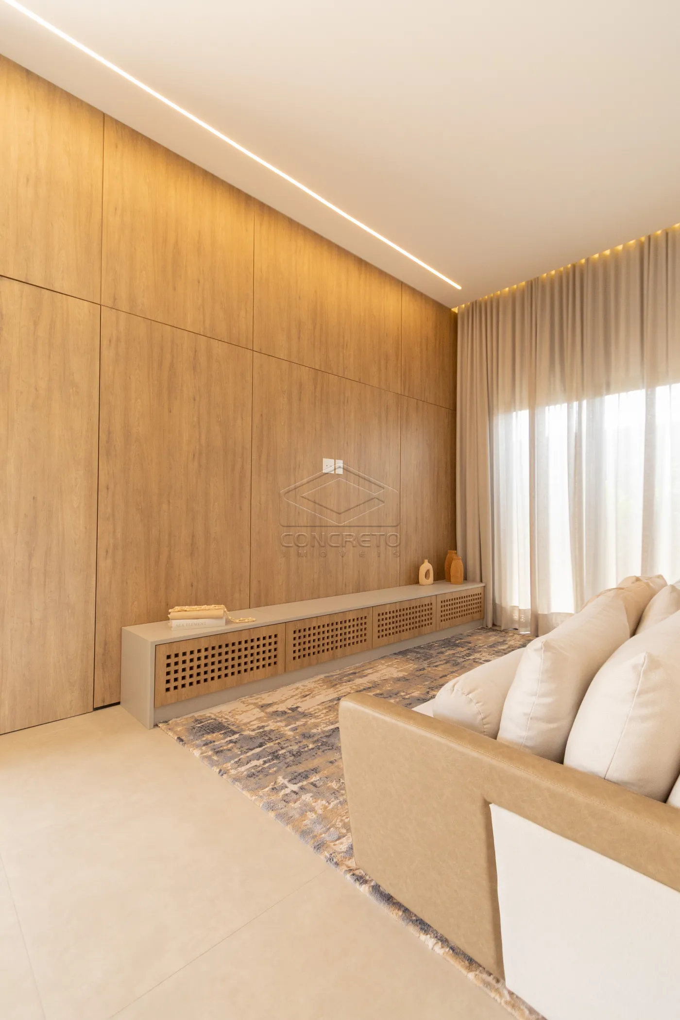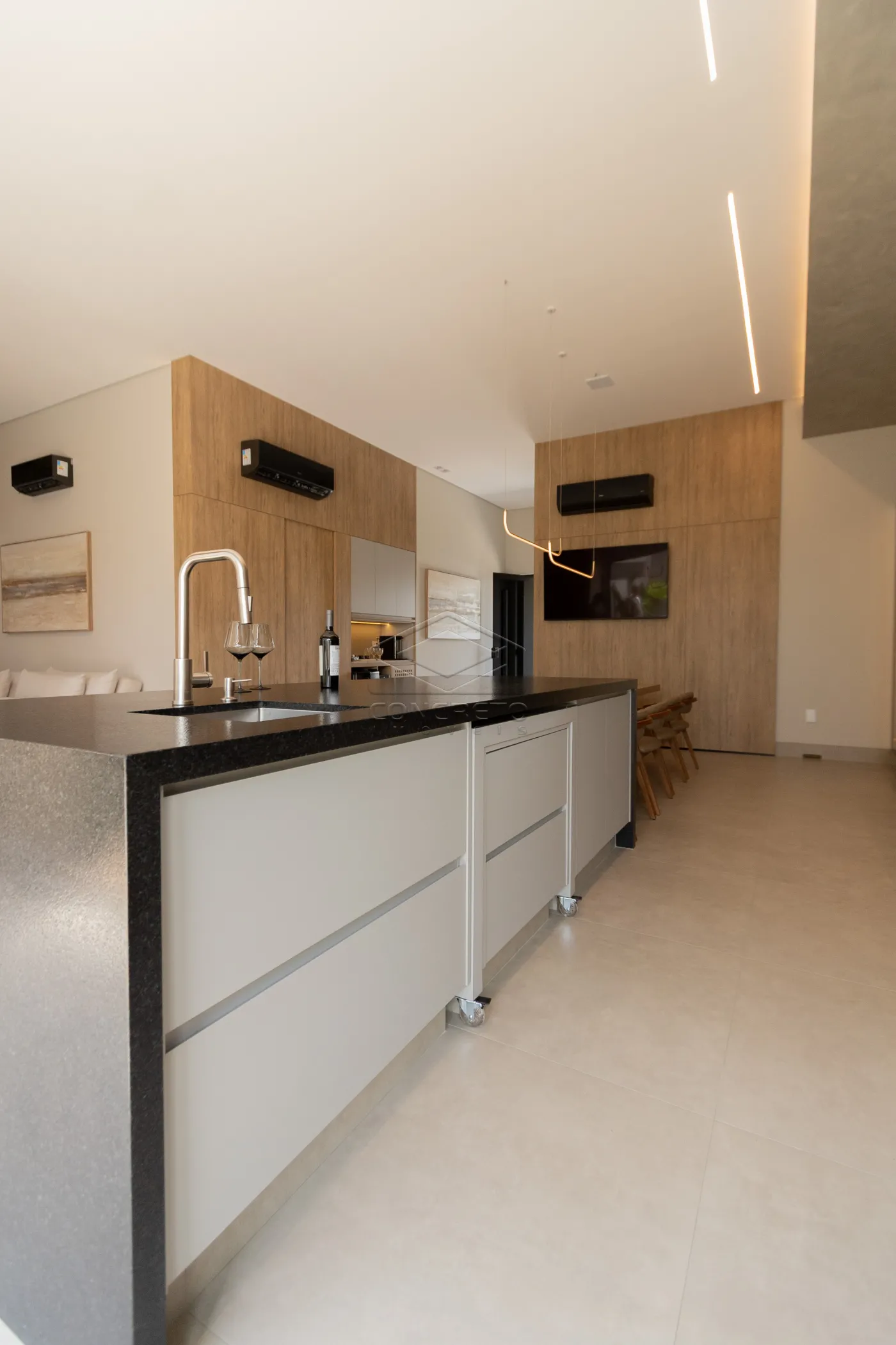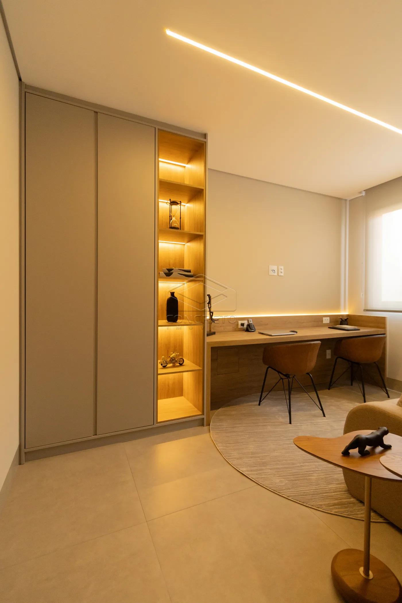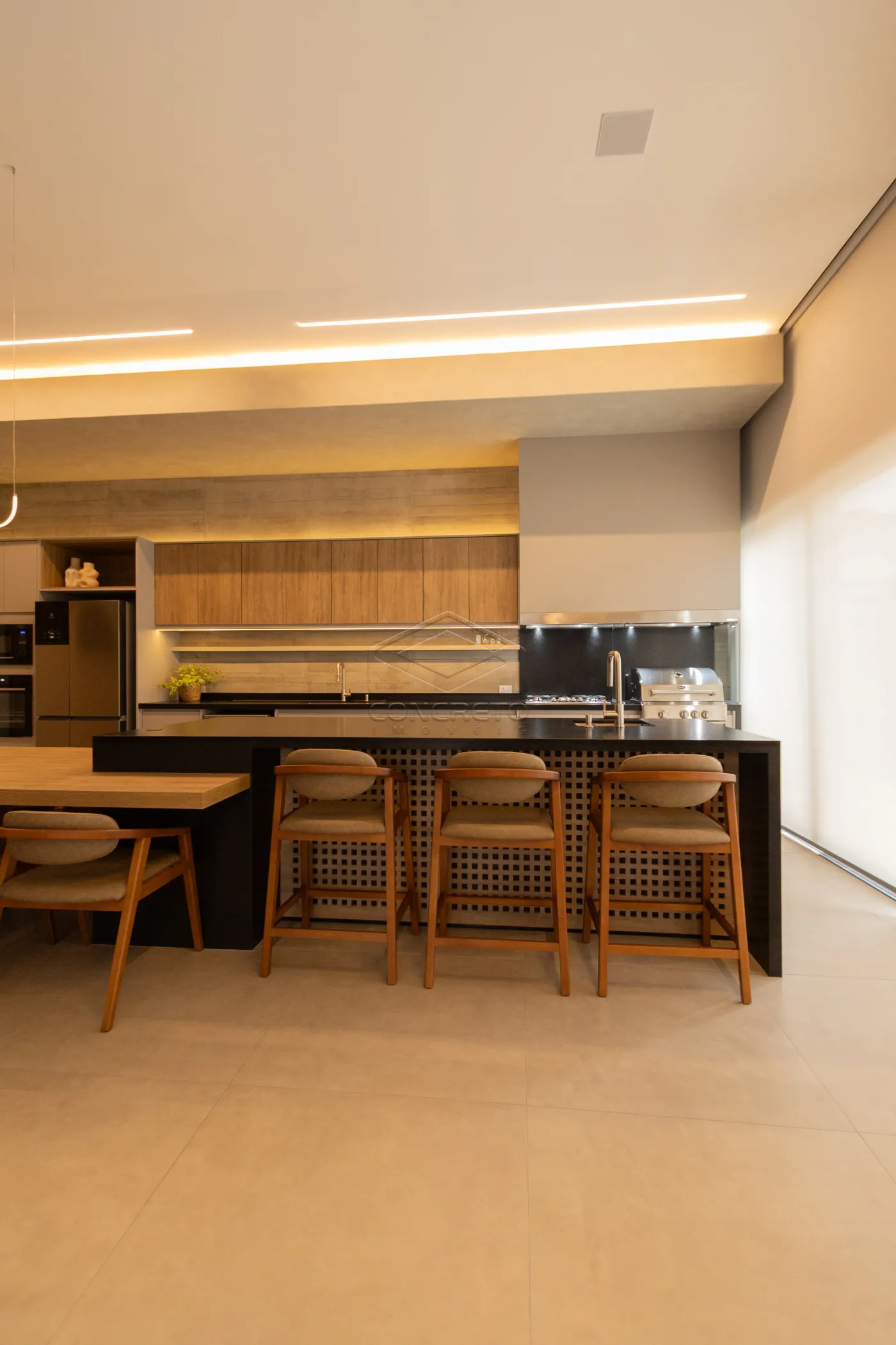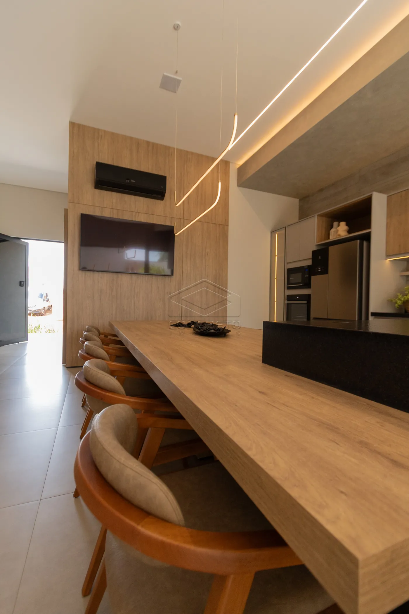 Sala de TV integrada ao espaço gourmet, com possibilidade de fechamento em marcenaria;