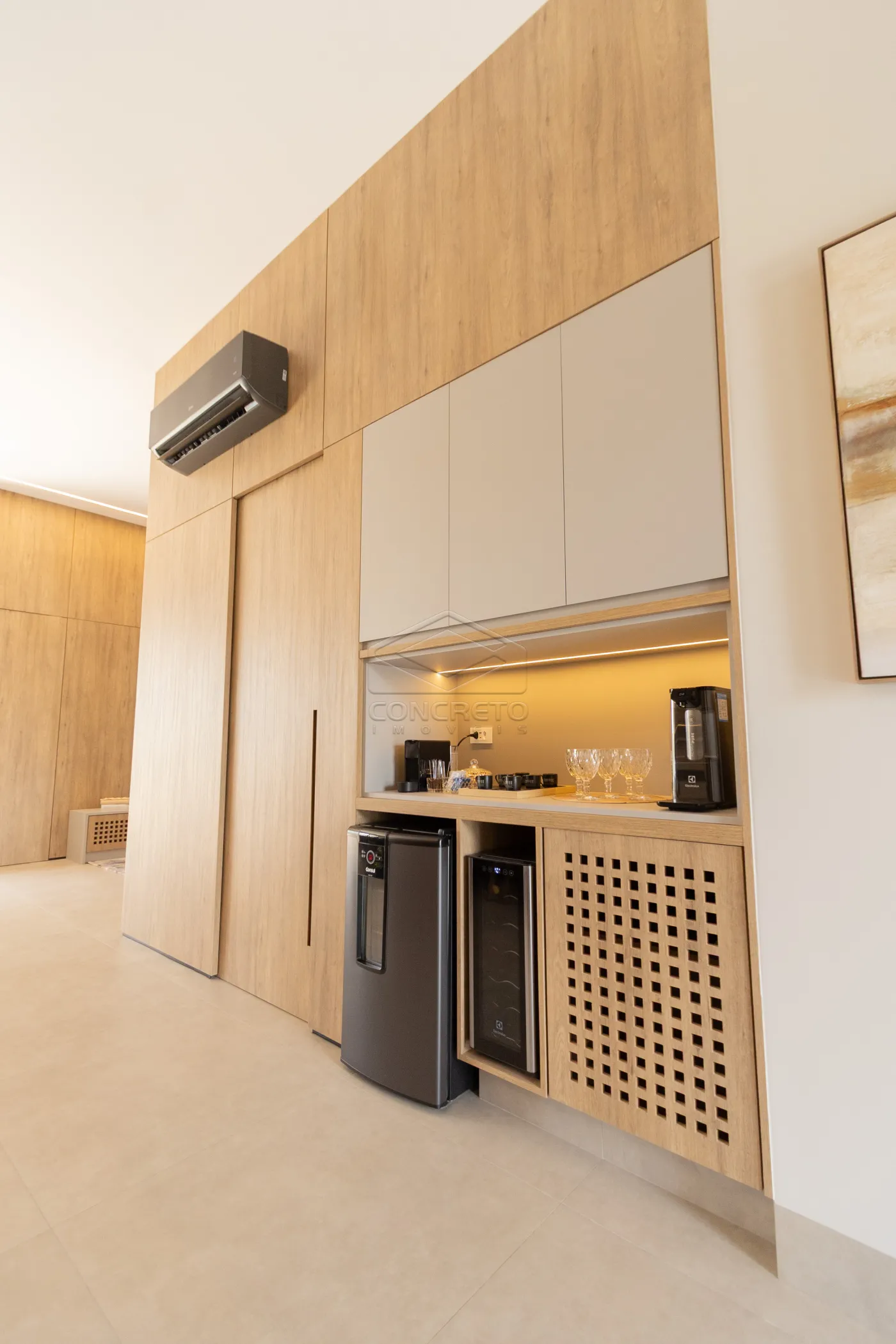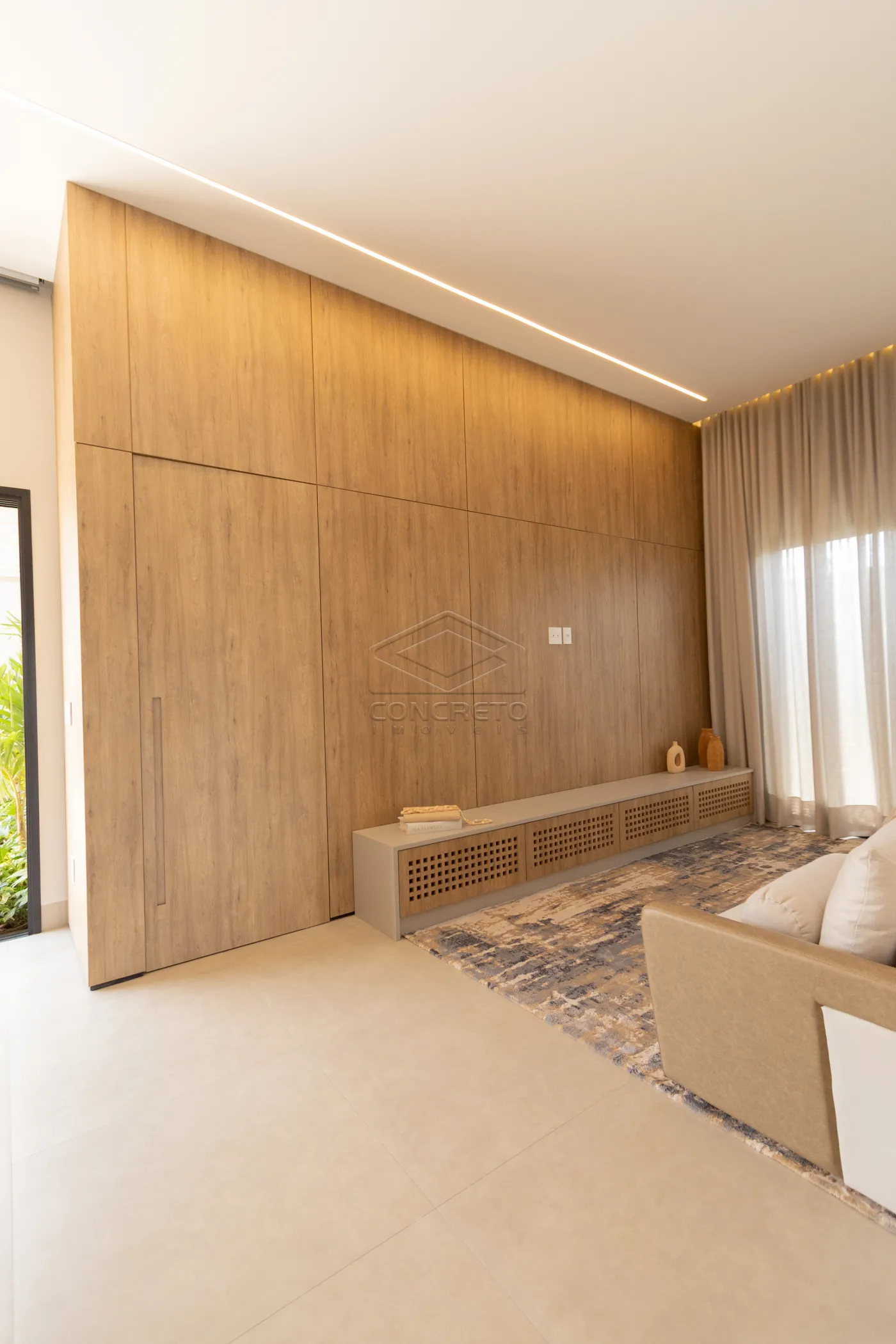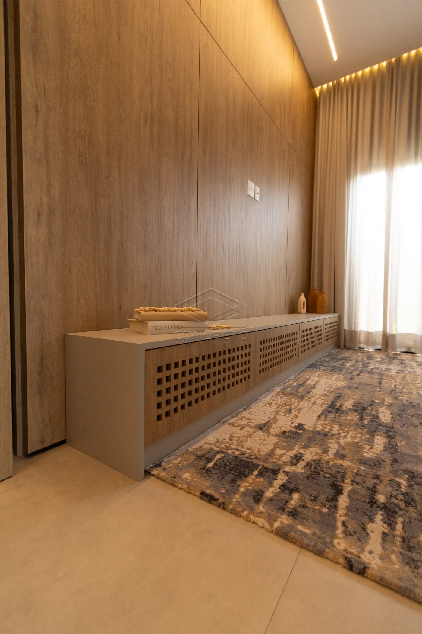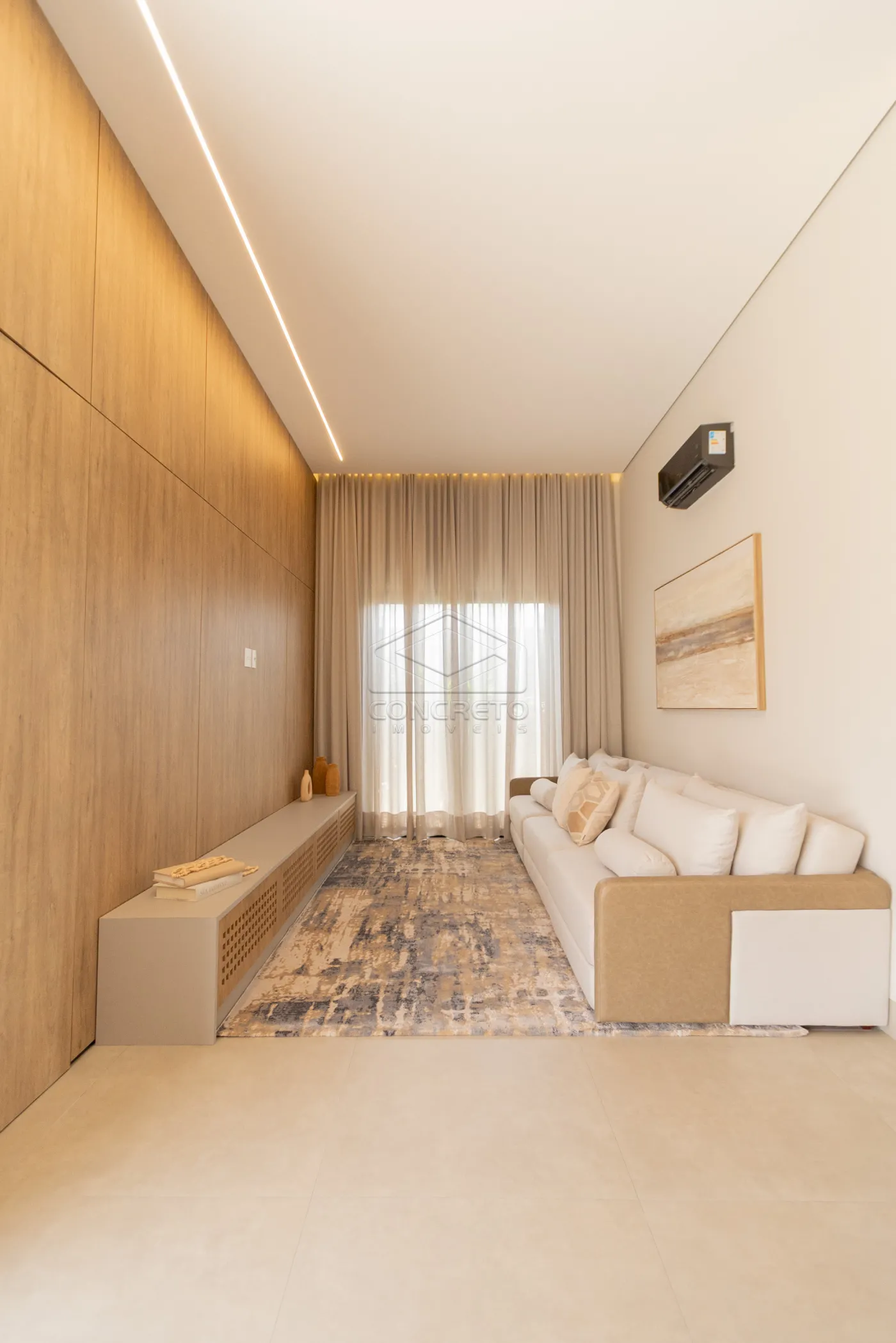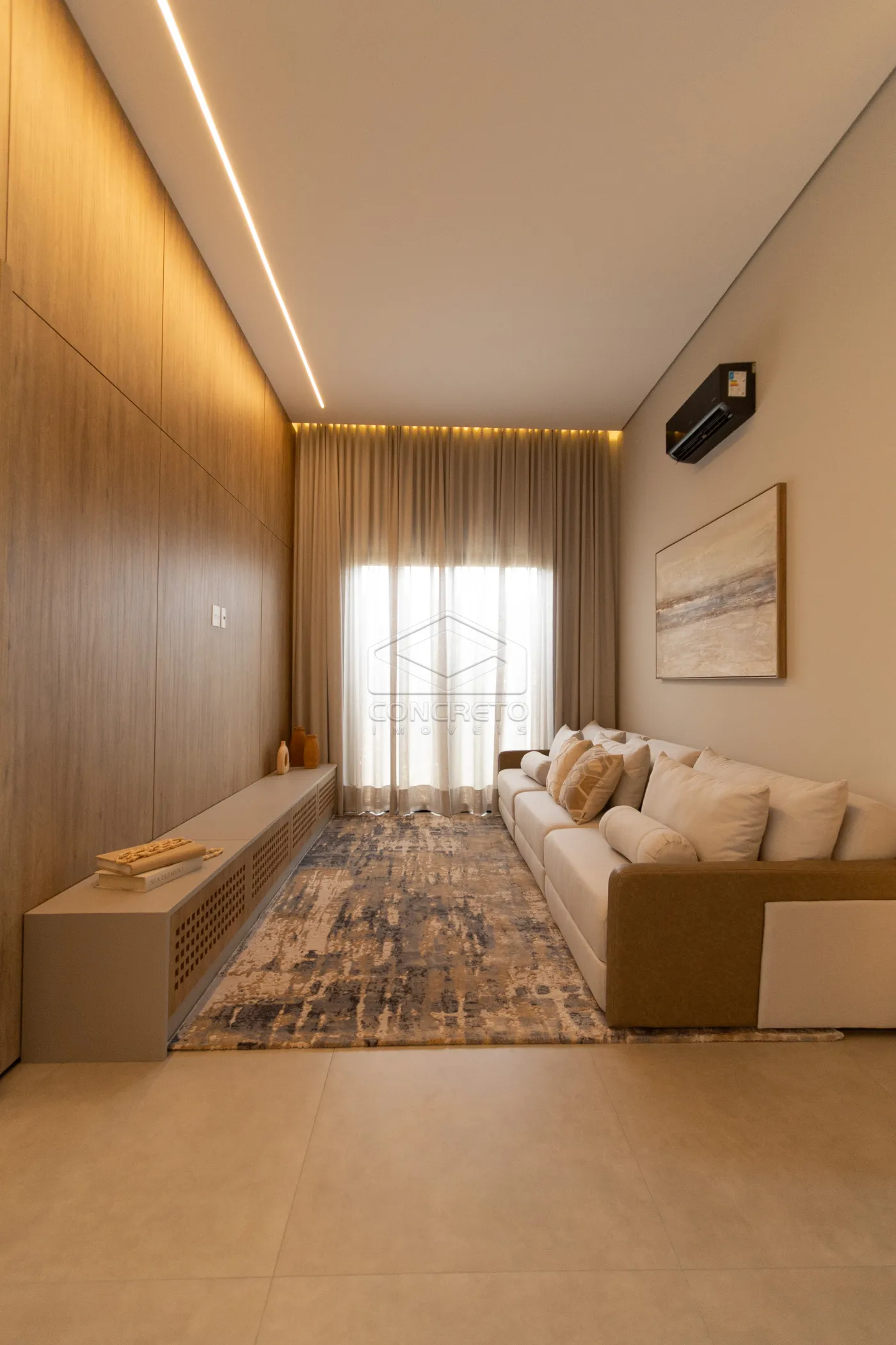 Sala de TV integrada ao espaço gourmet, com possibilidade de fechamento em marcenaria;