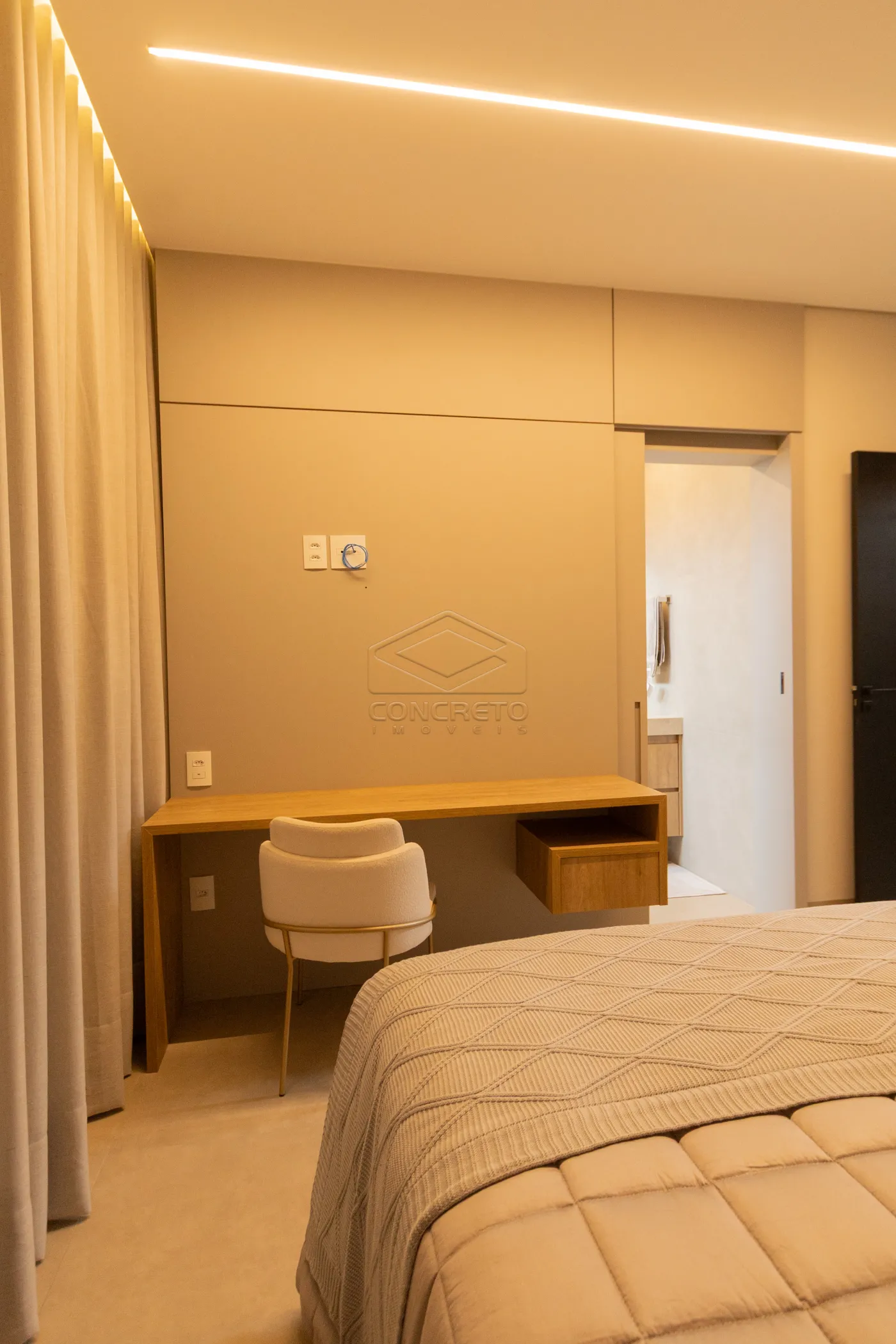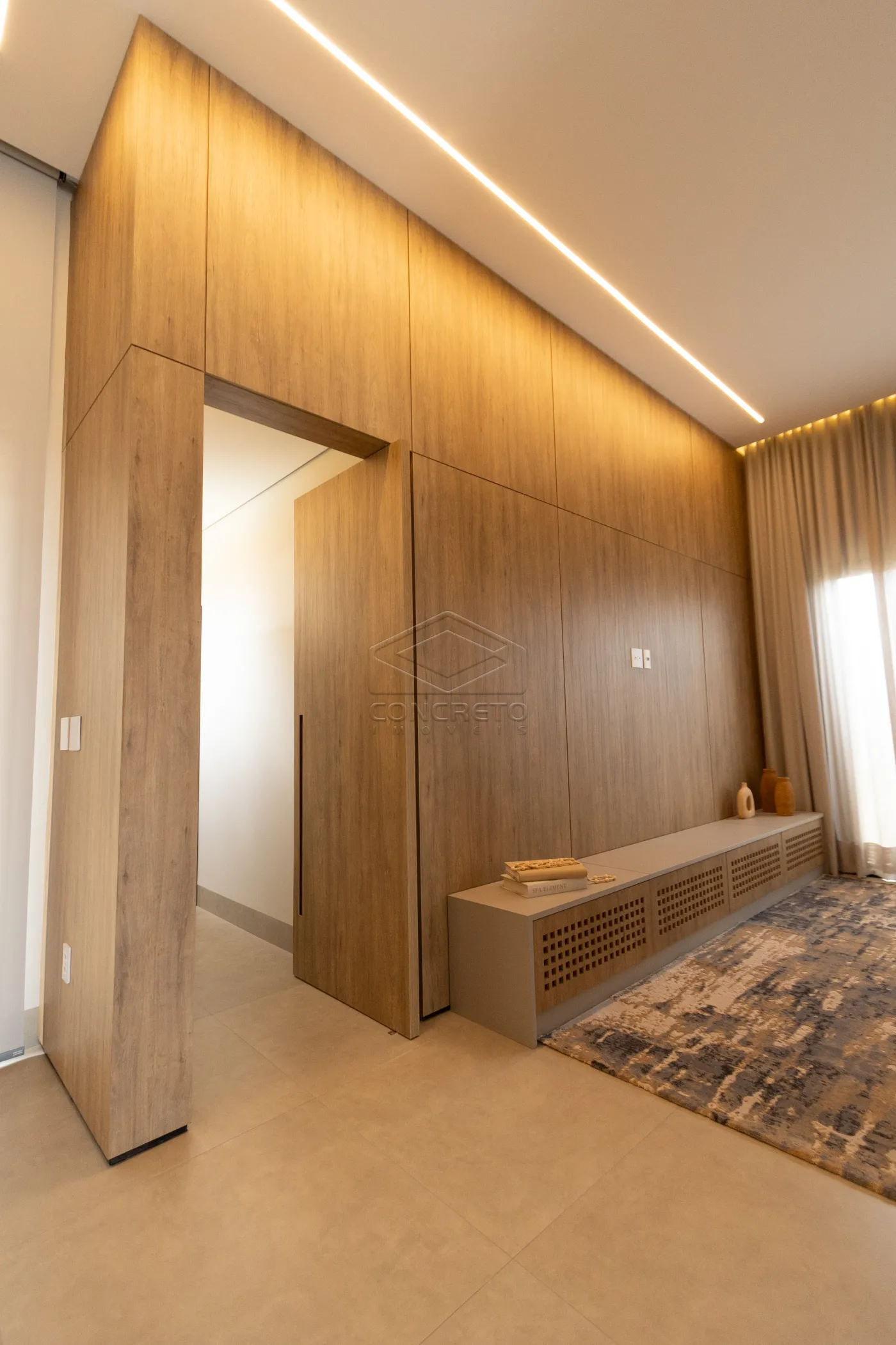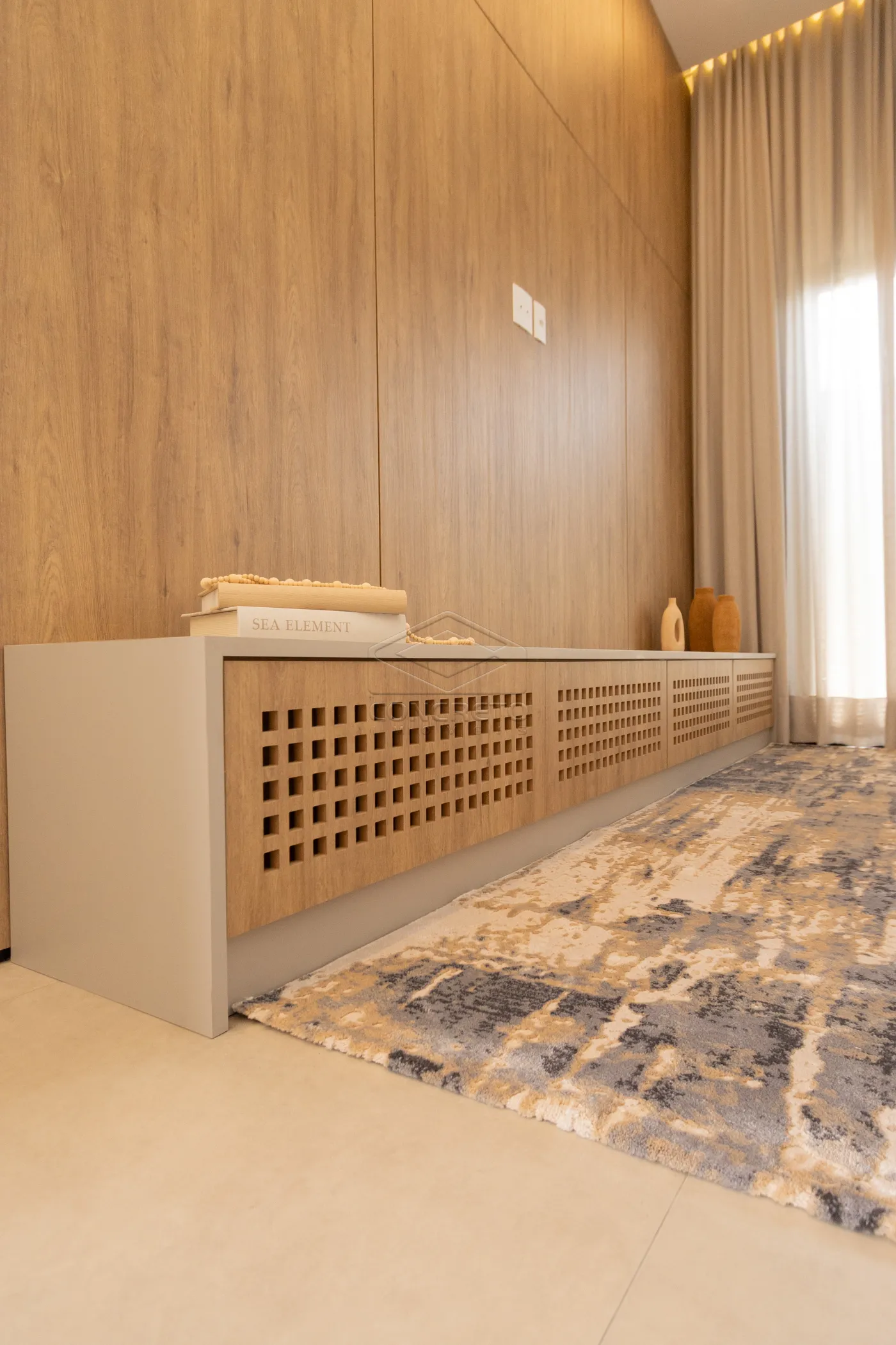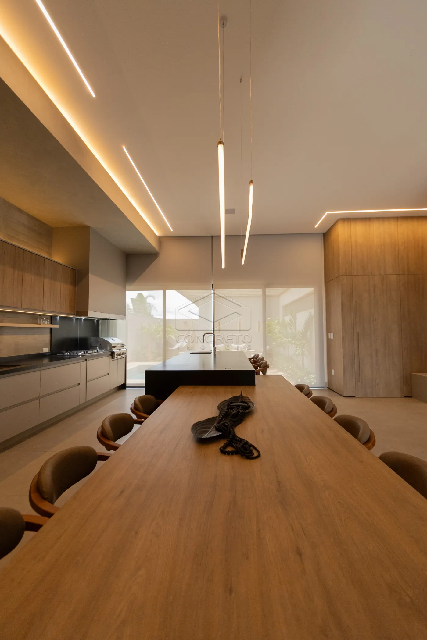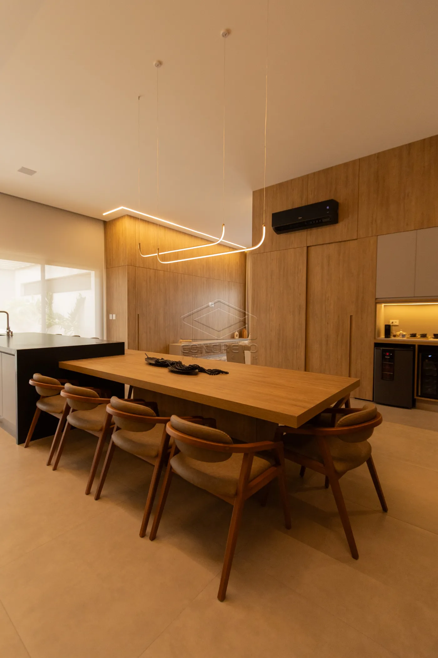 Sala de TV integrada ao espaço gourmet, com possibilidade de fechamento em marcenaria;