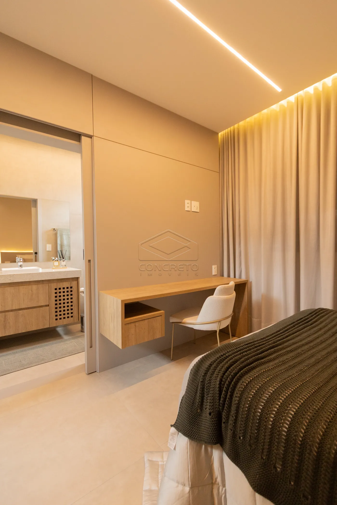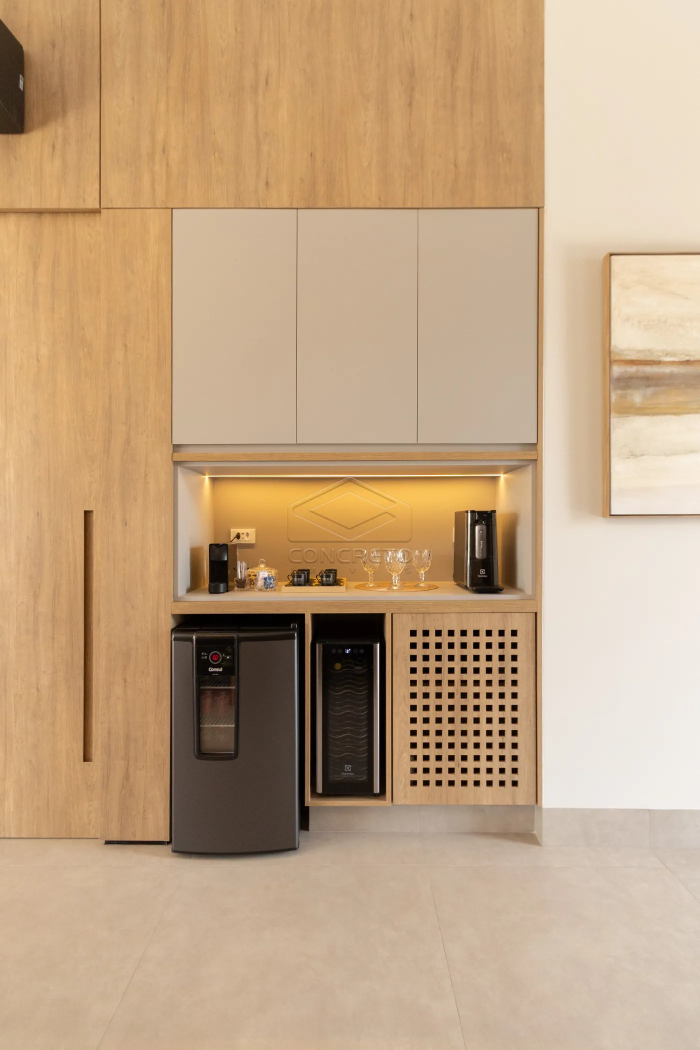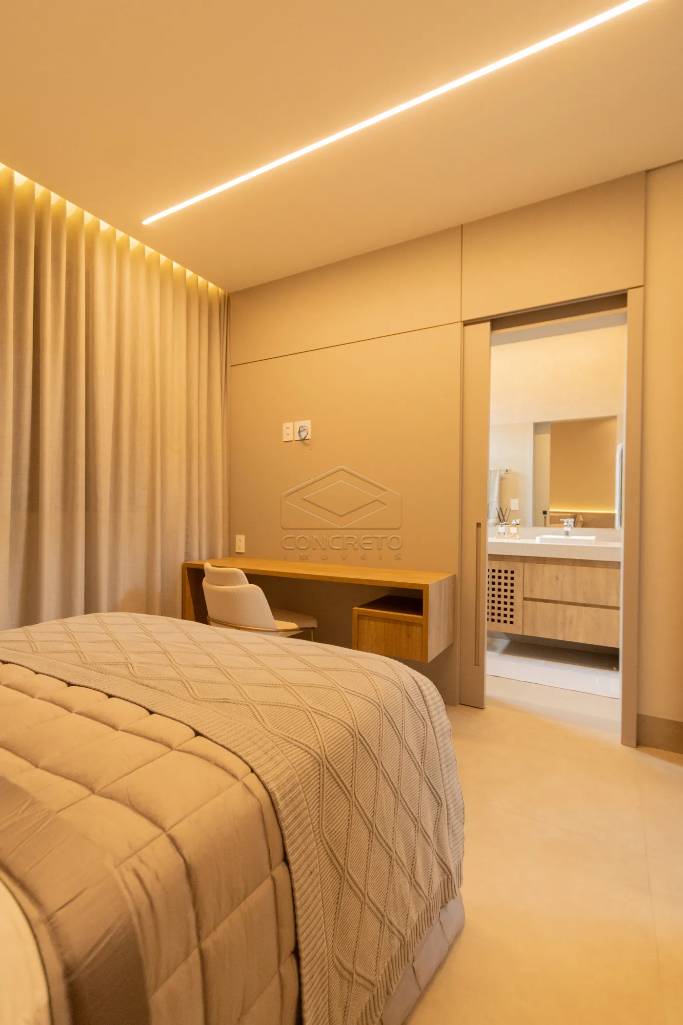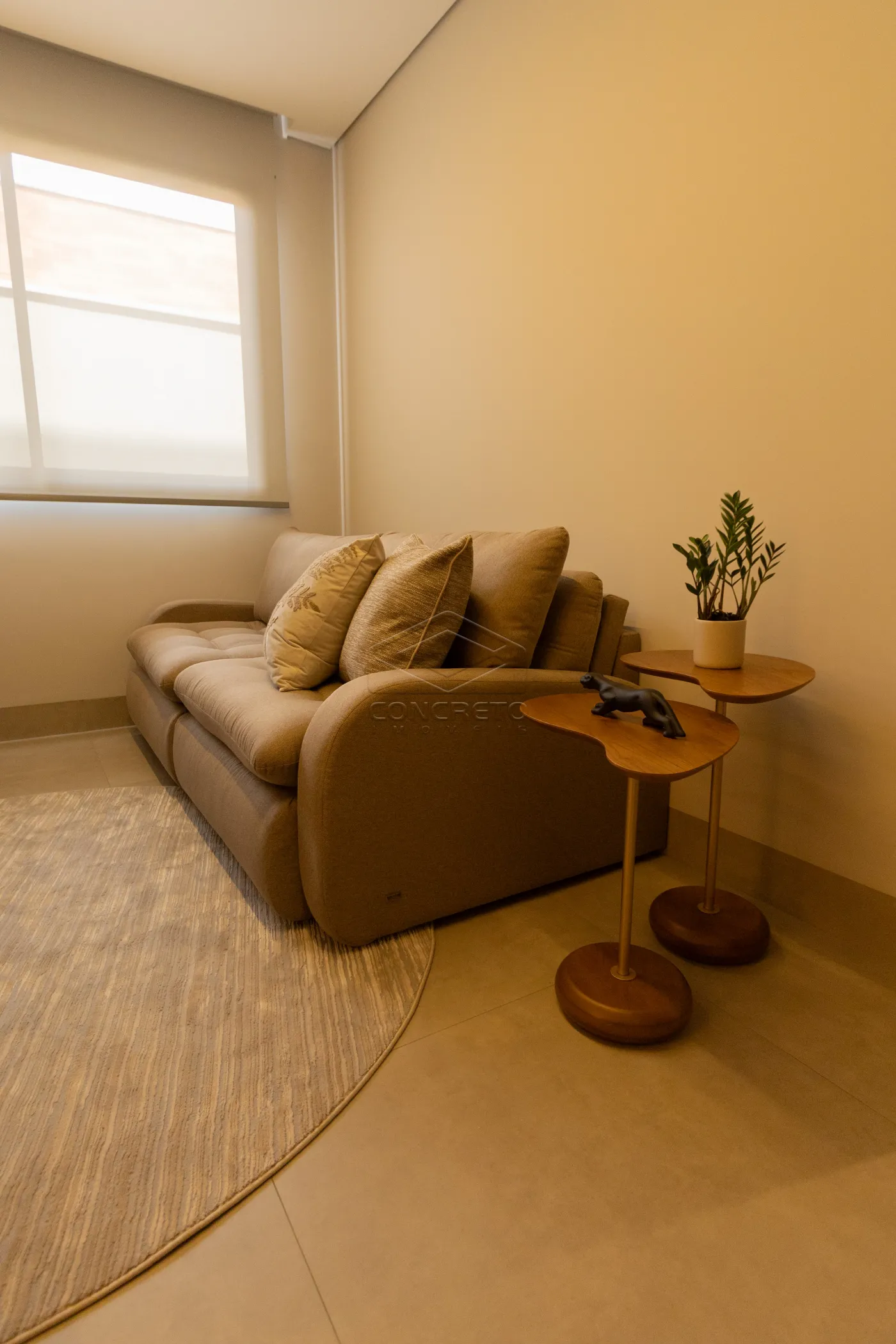 Sala de TV integrada ao espaço gourmet, com possibilidade de fechamento em marcenaria;
