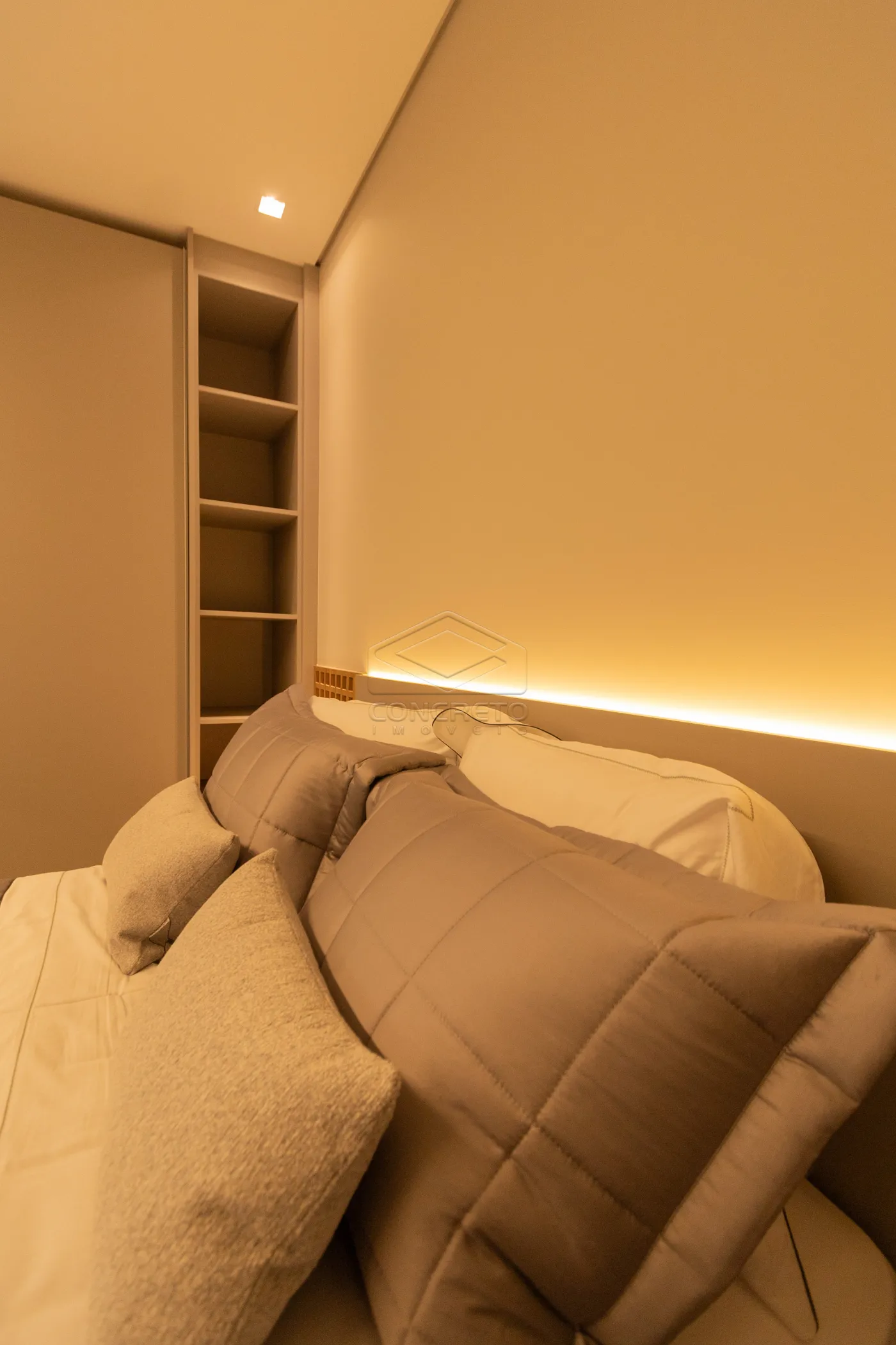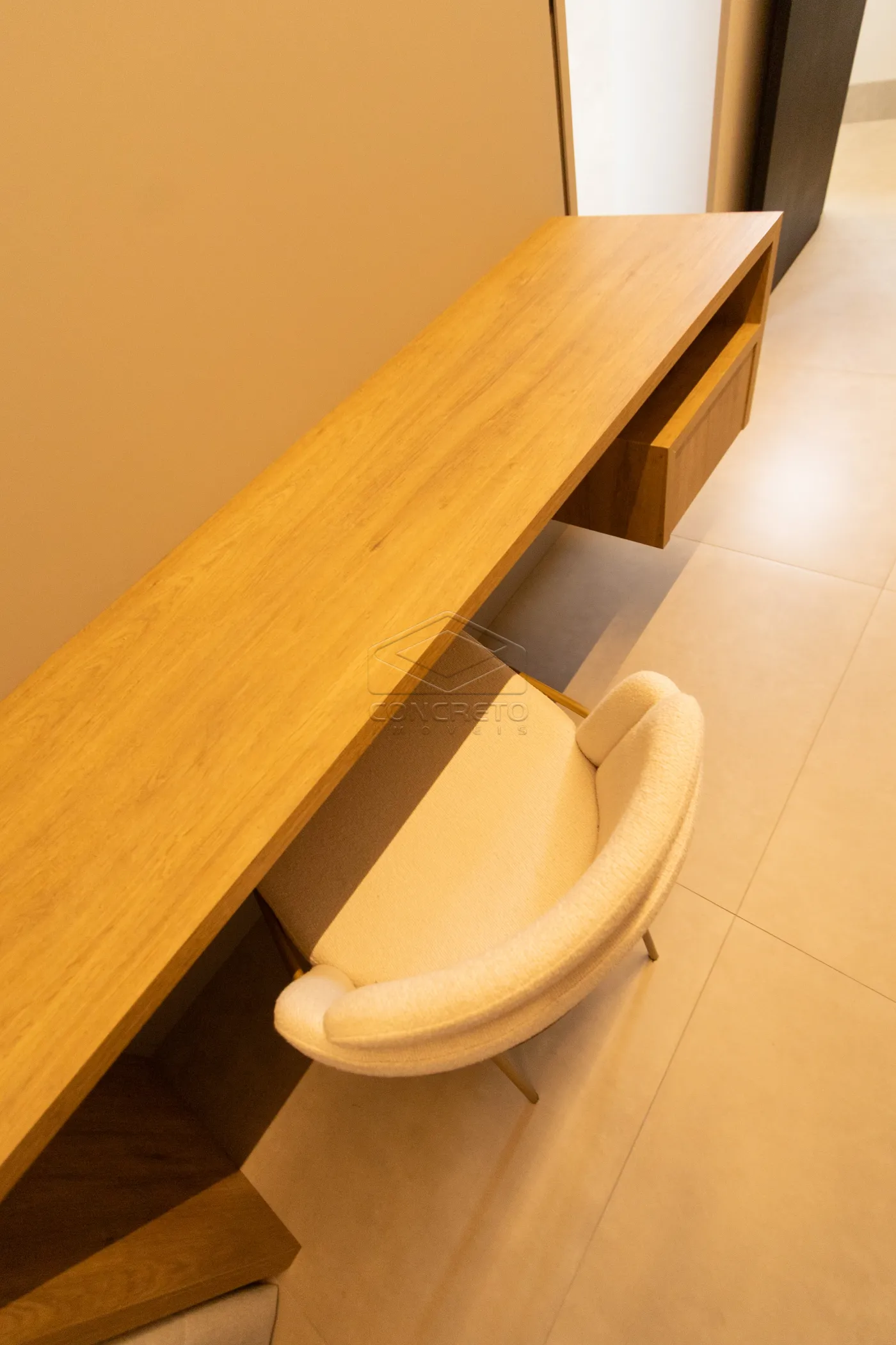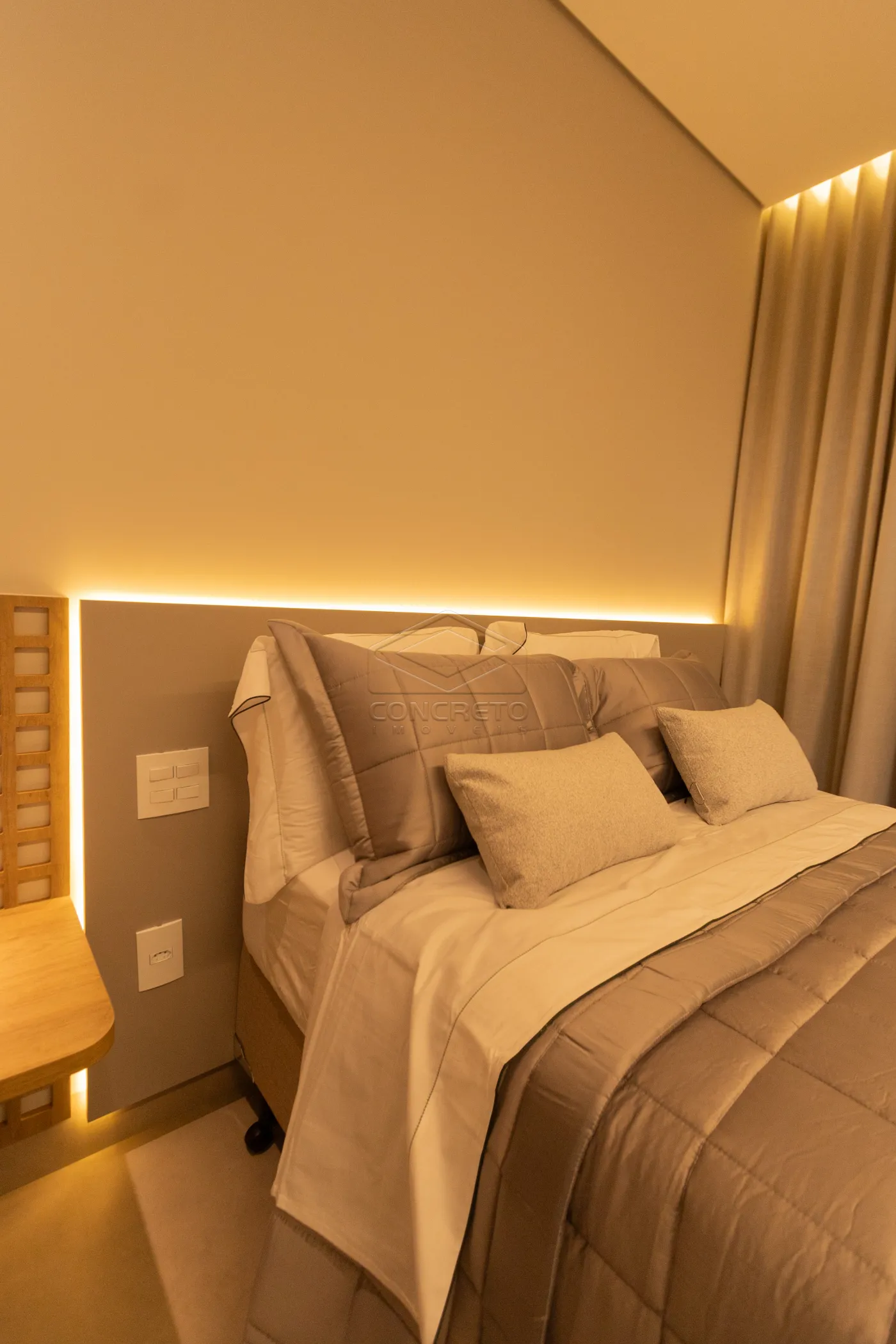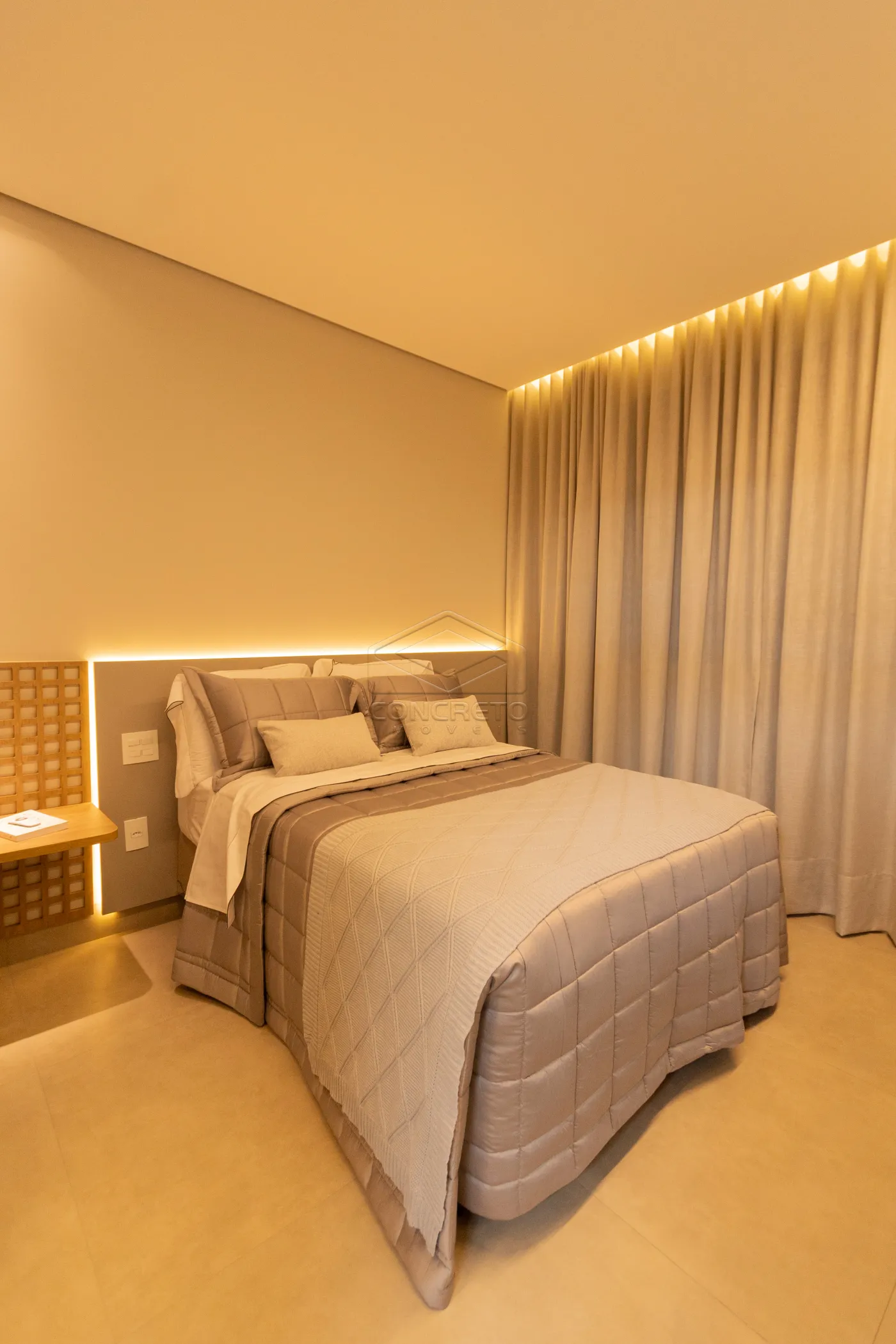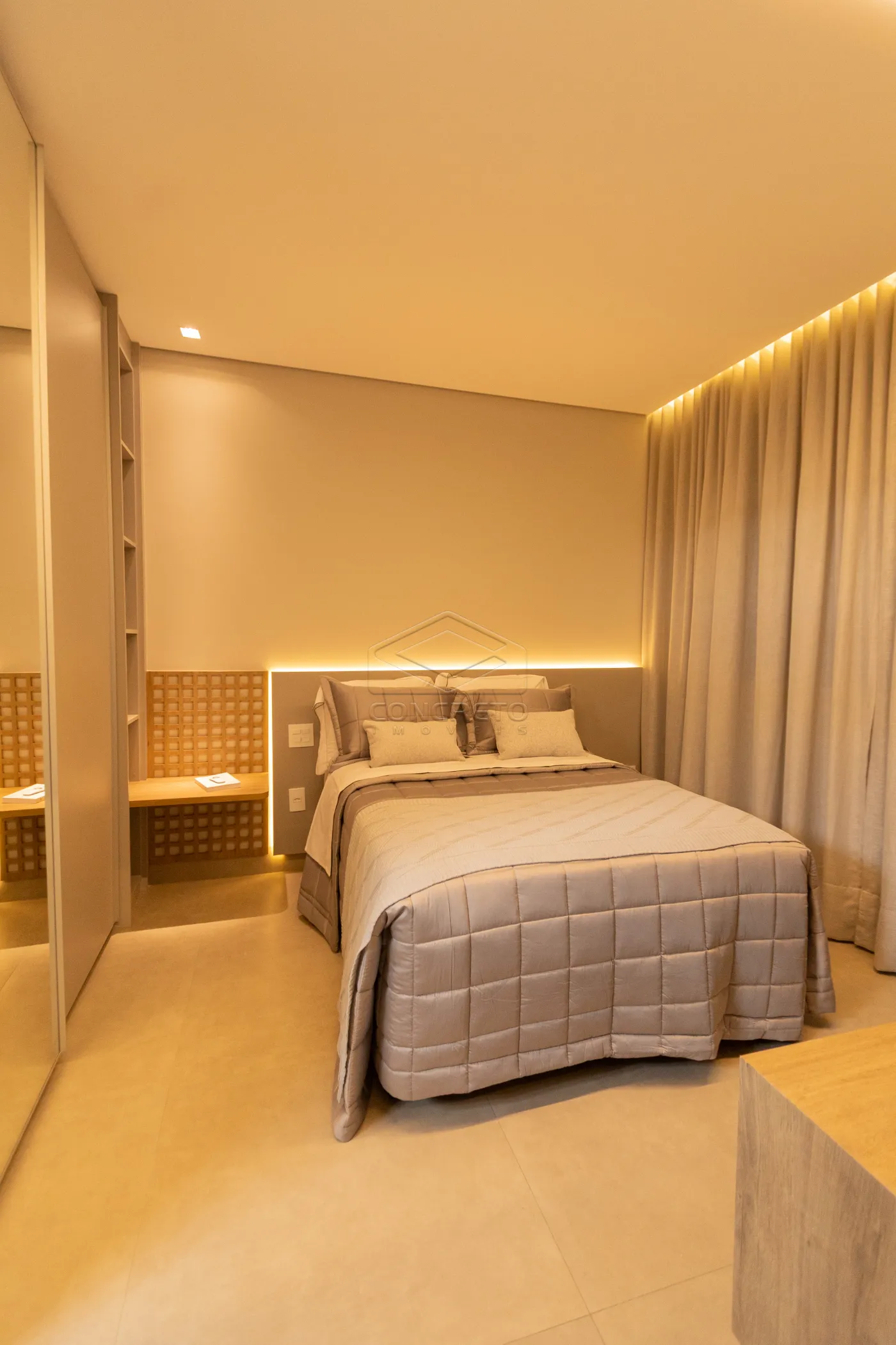 Sala de TV integrada ao espaço gourmet, com possibilidade de fechamento em marcenaria;