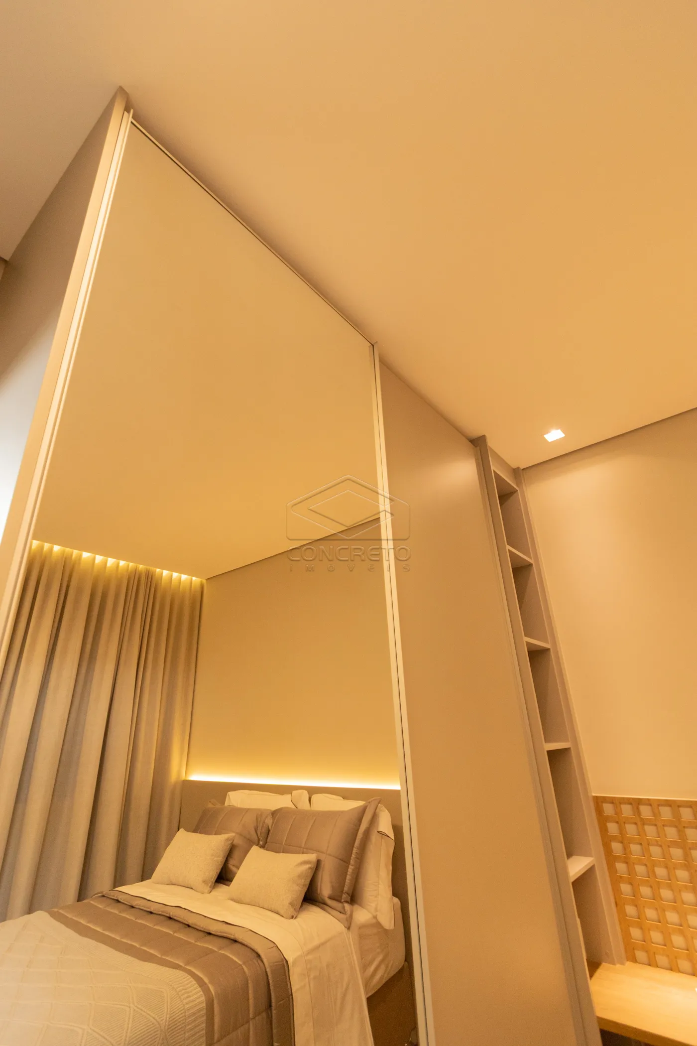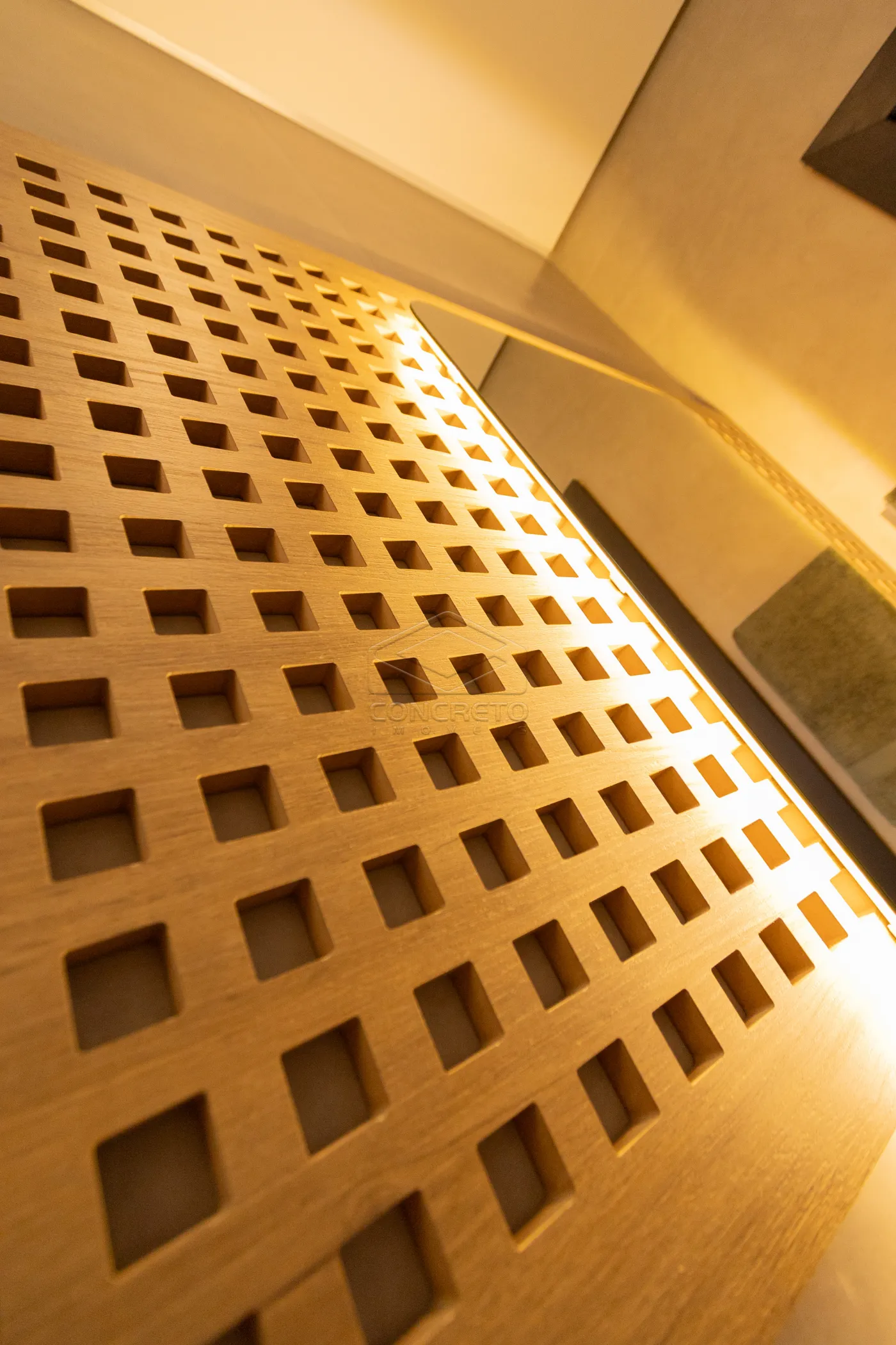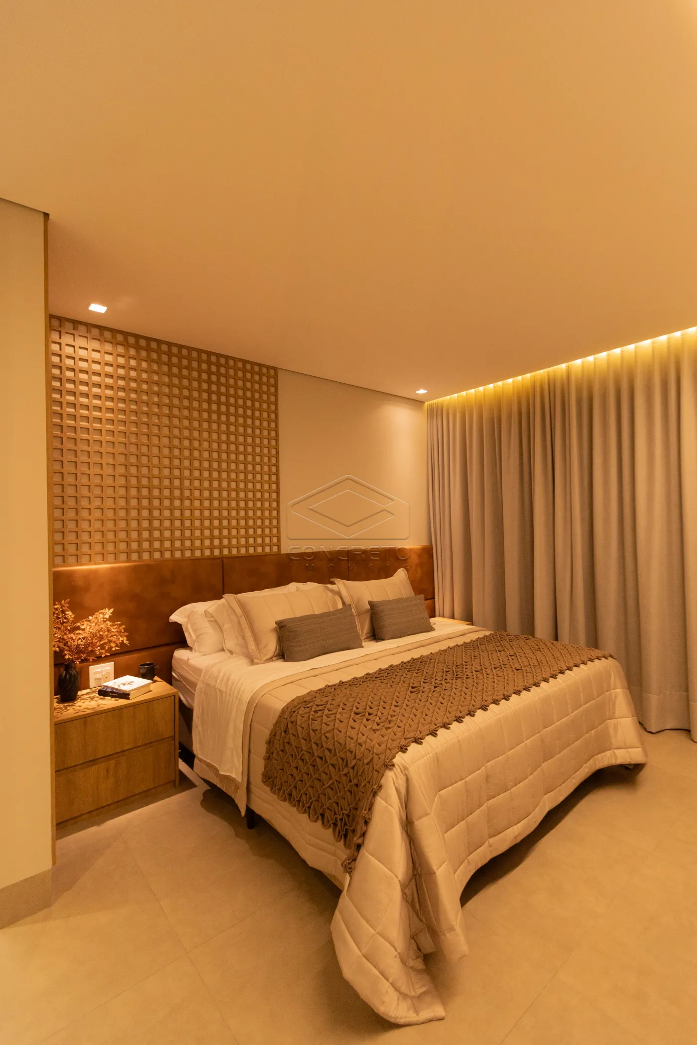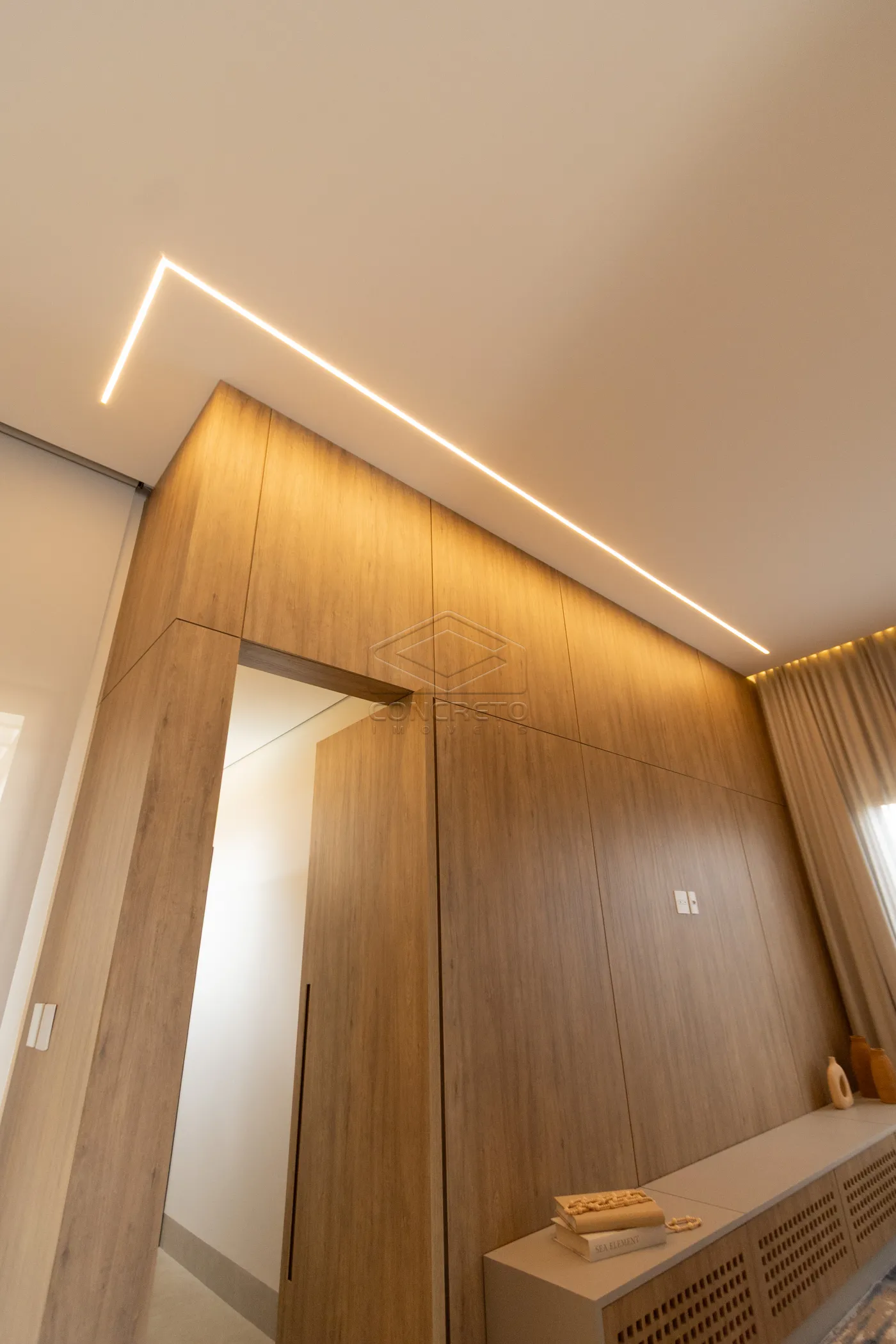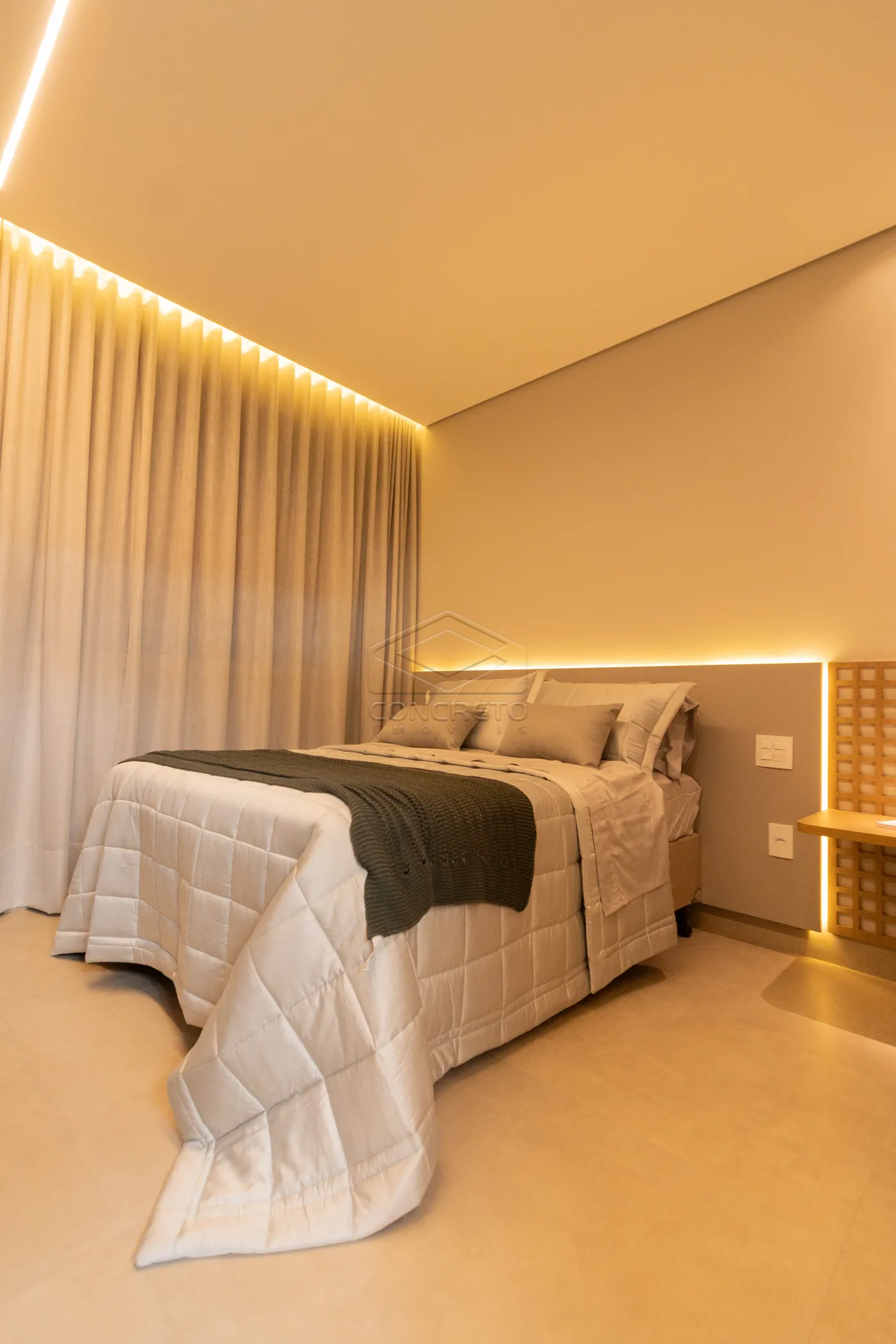 Sala de TV integrada ao espaço gourmet, com possibilidade de fechamento em marcenaria;