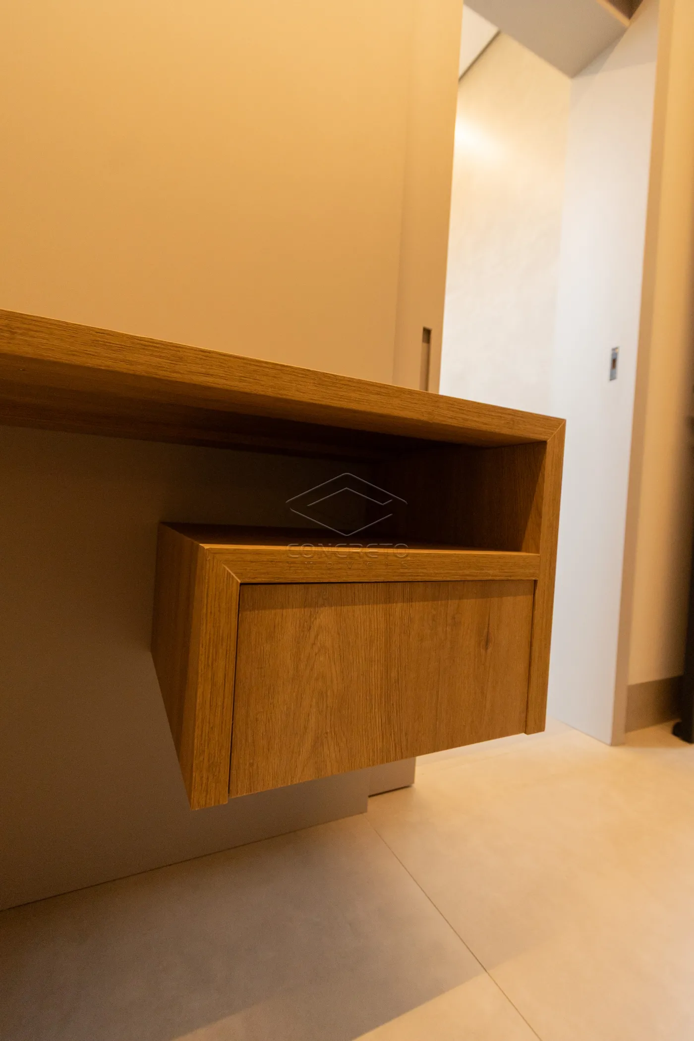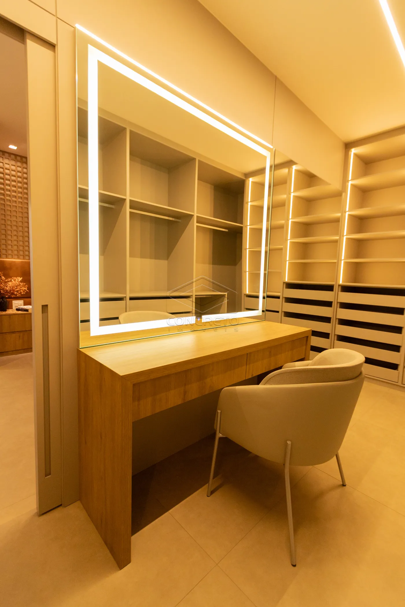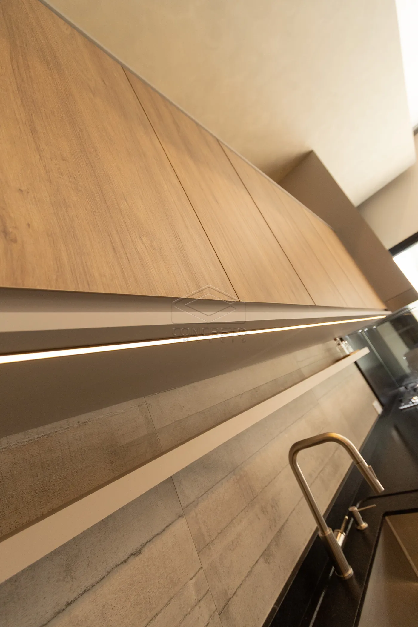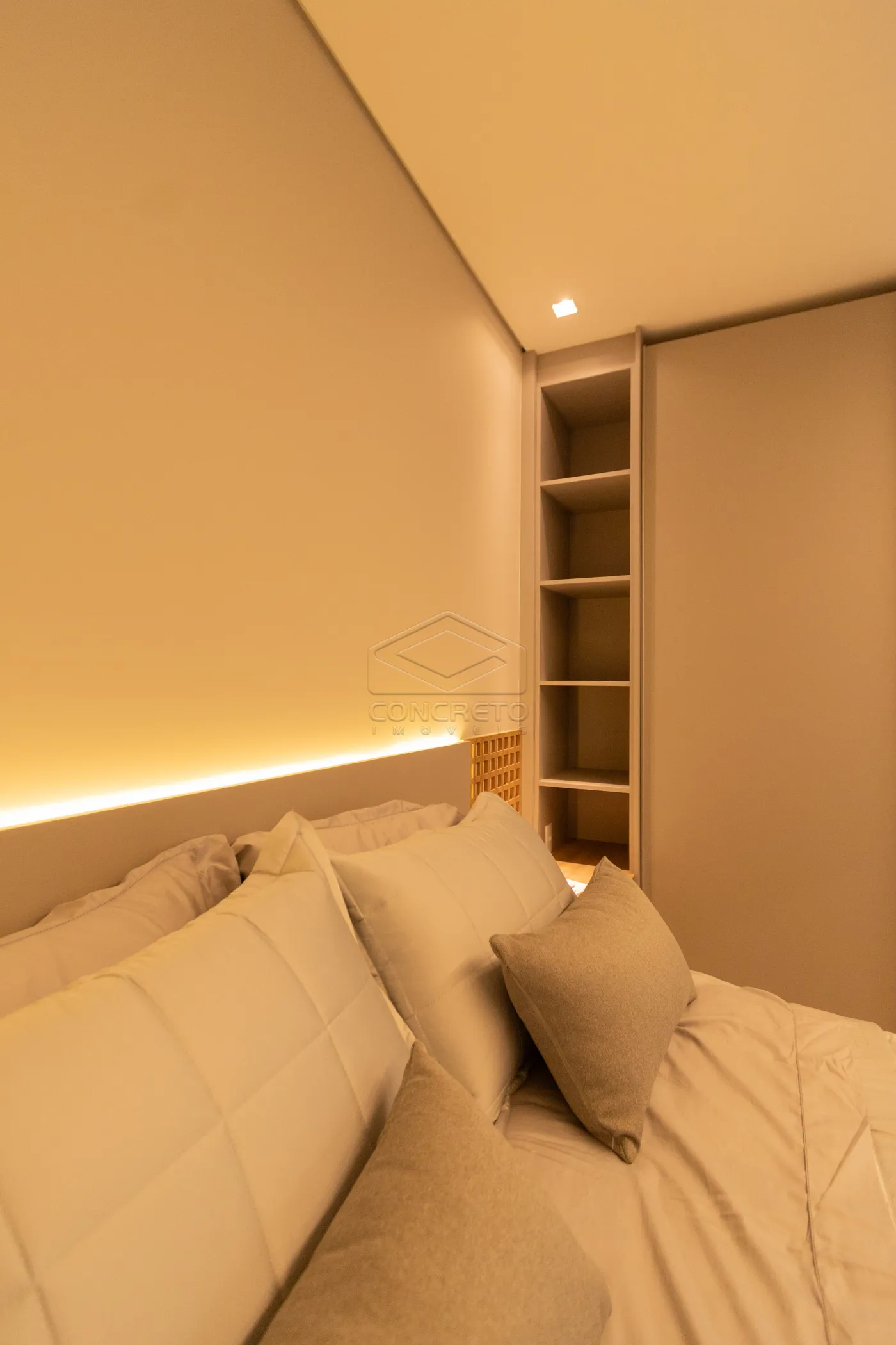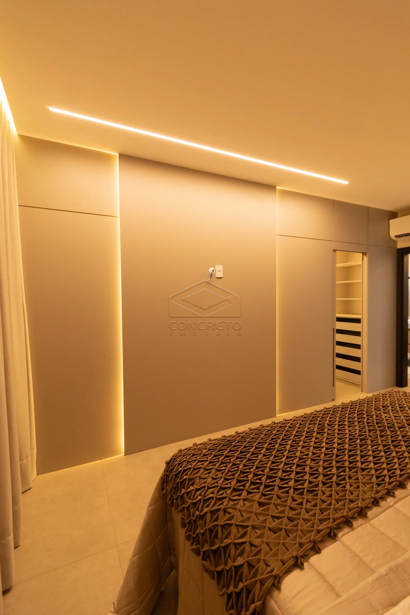 Sala de TV integrada ao espaço gourmet, com possibilidade de fechamento em marcenaria;