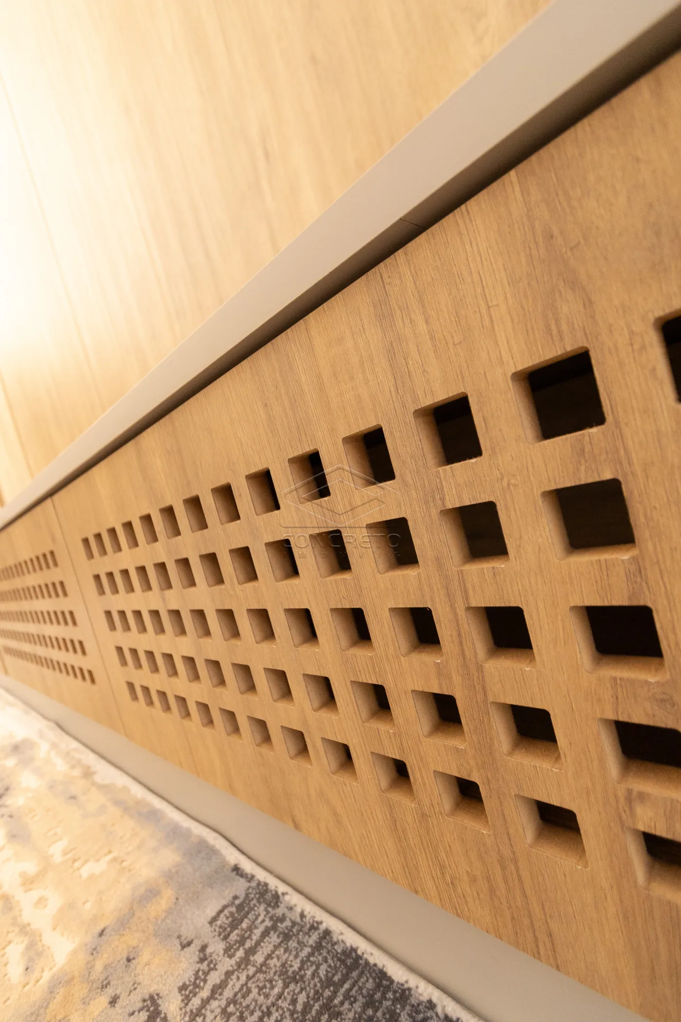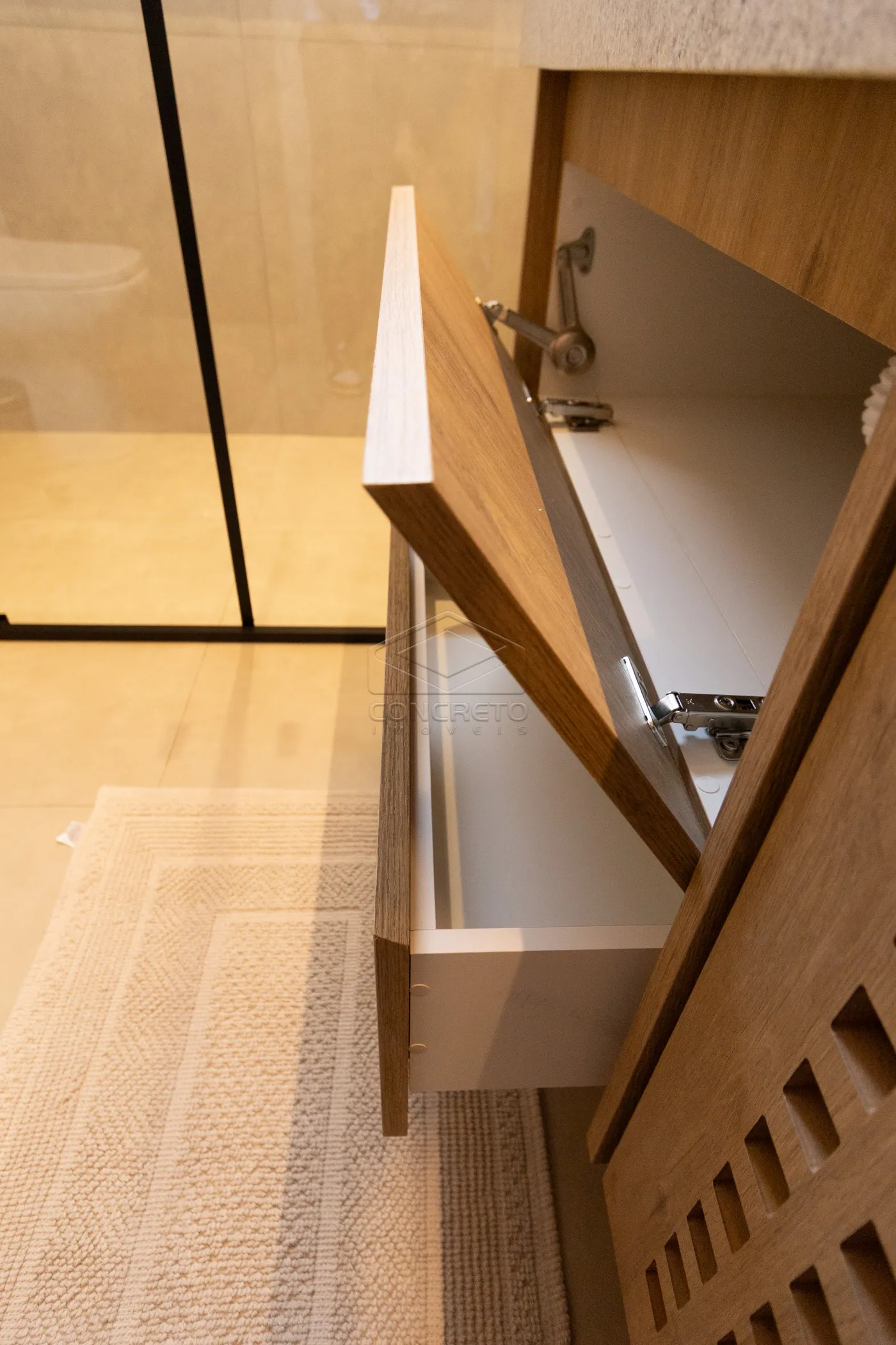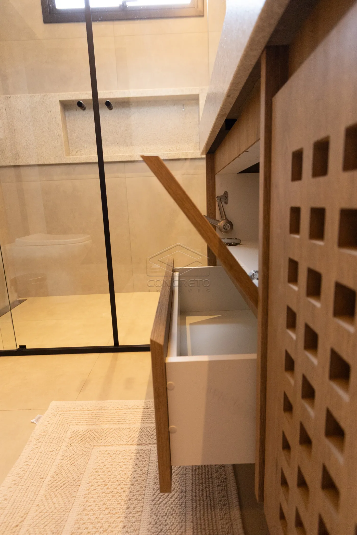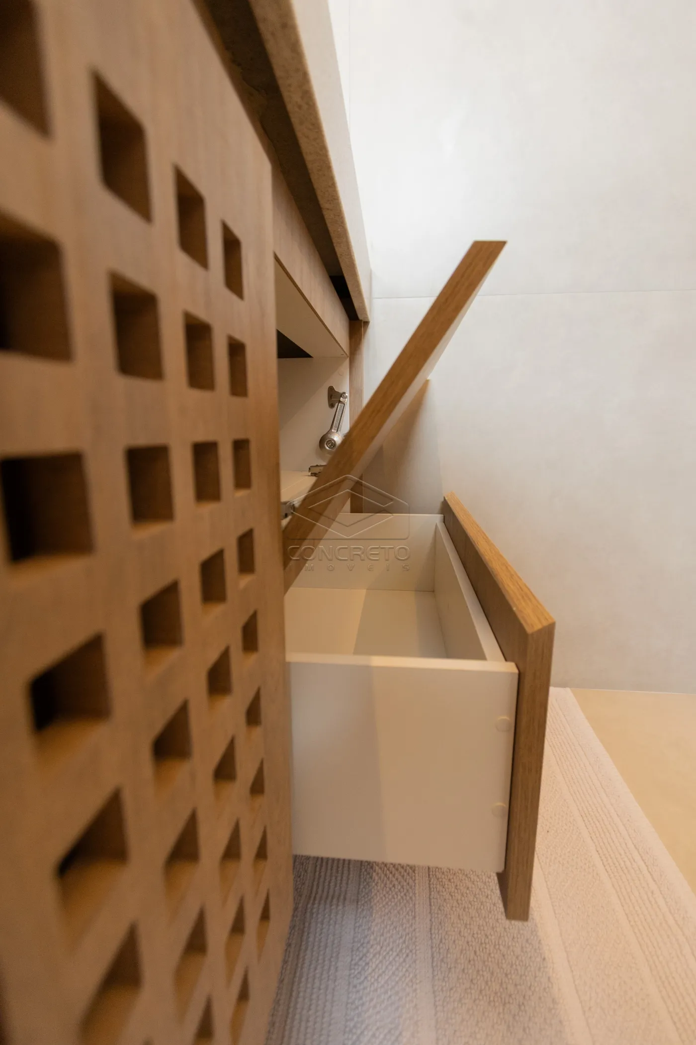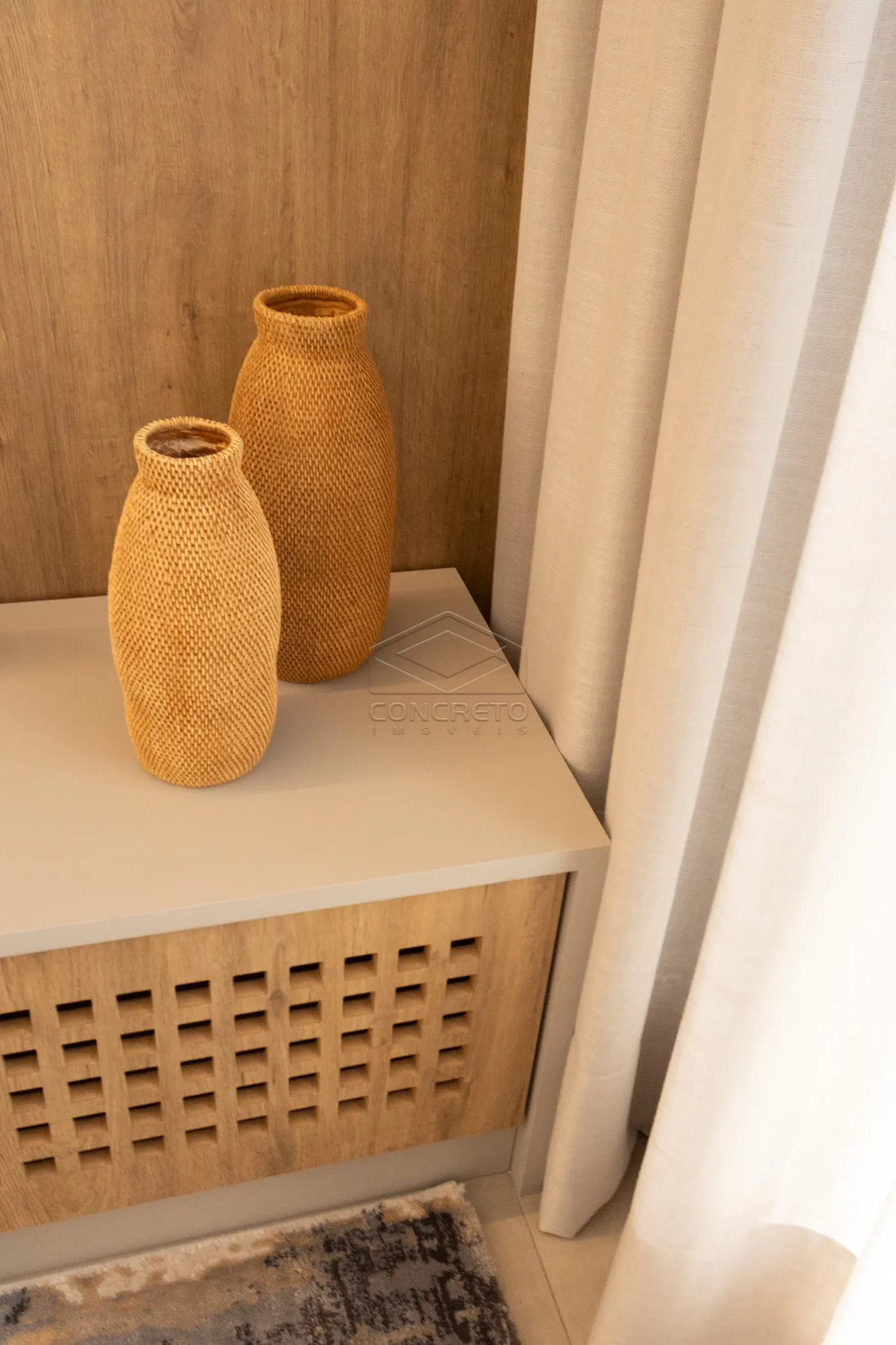 Sala de TV integrada ao espaço gourmet, com possibilidade de fechamento em marcenaria;