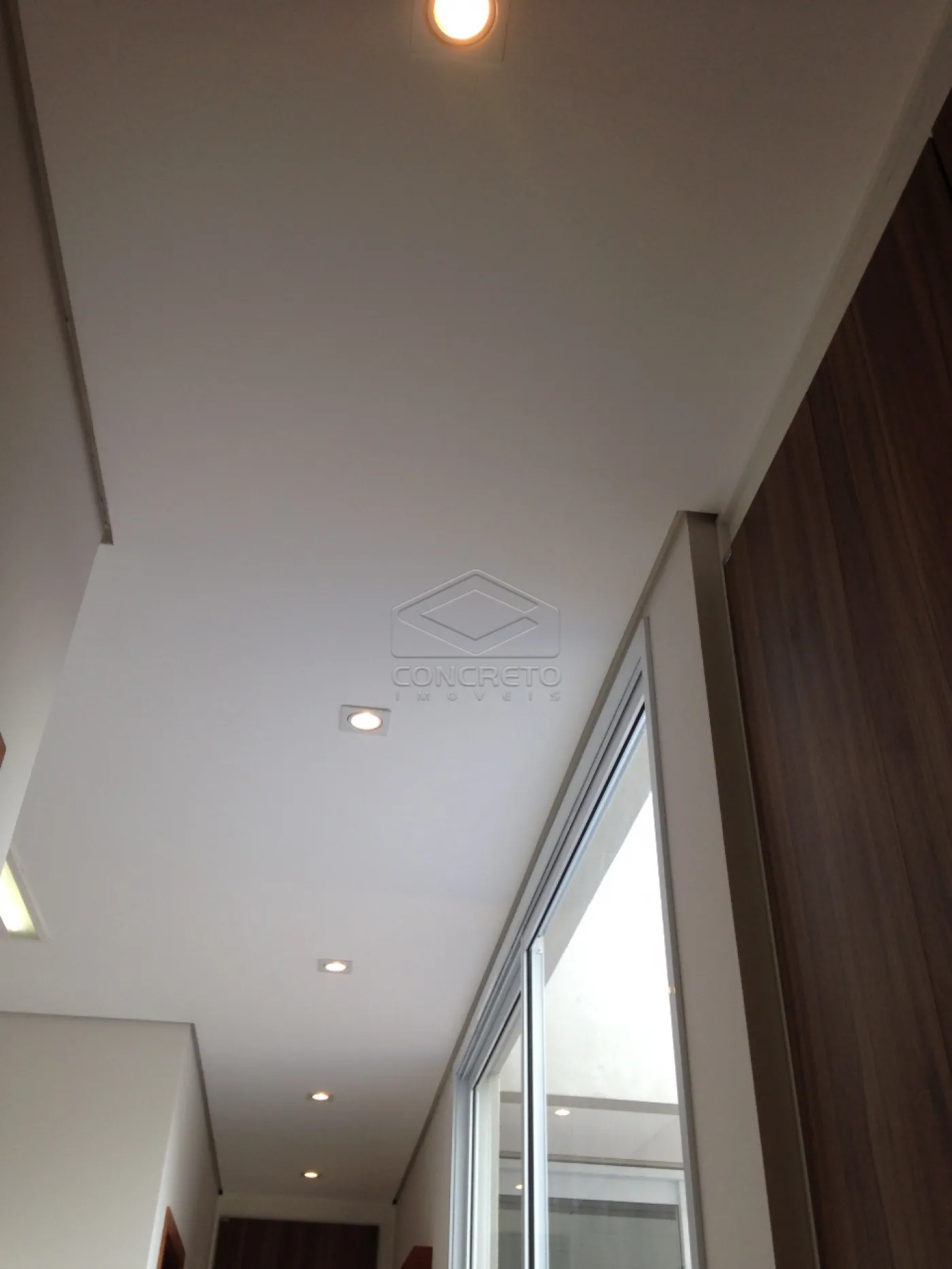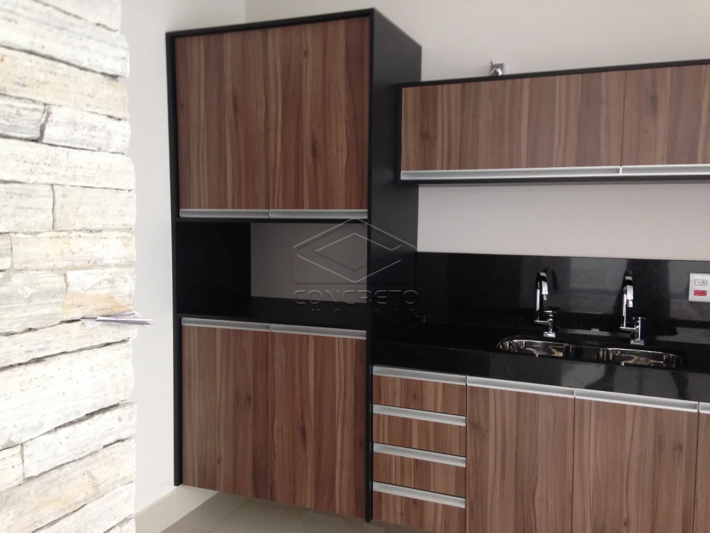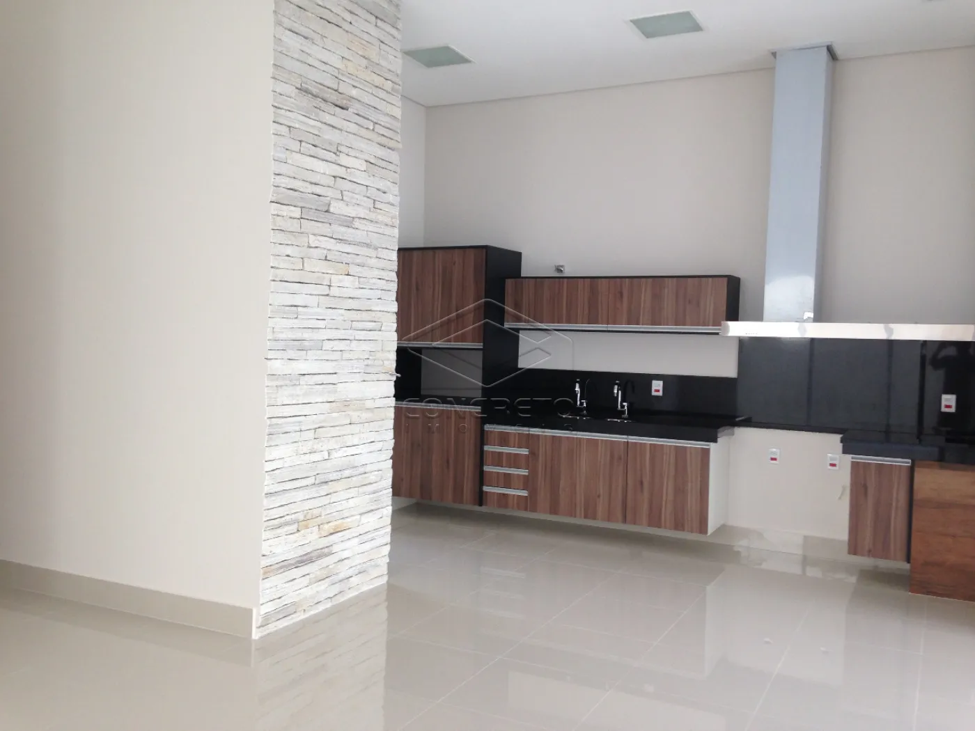 Gourmet integrado com pé direito alto e armários;