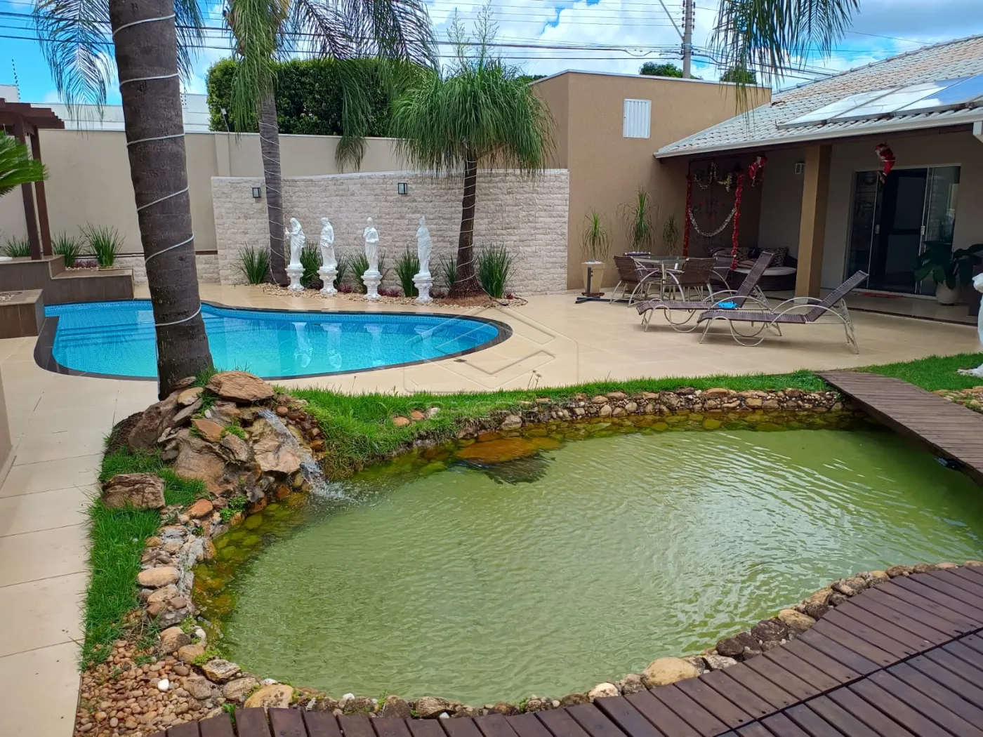 Sauna, piscina, jacuzzi e lago para peixes.