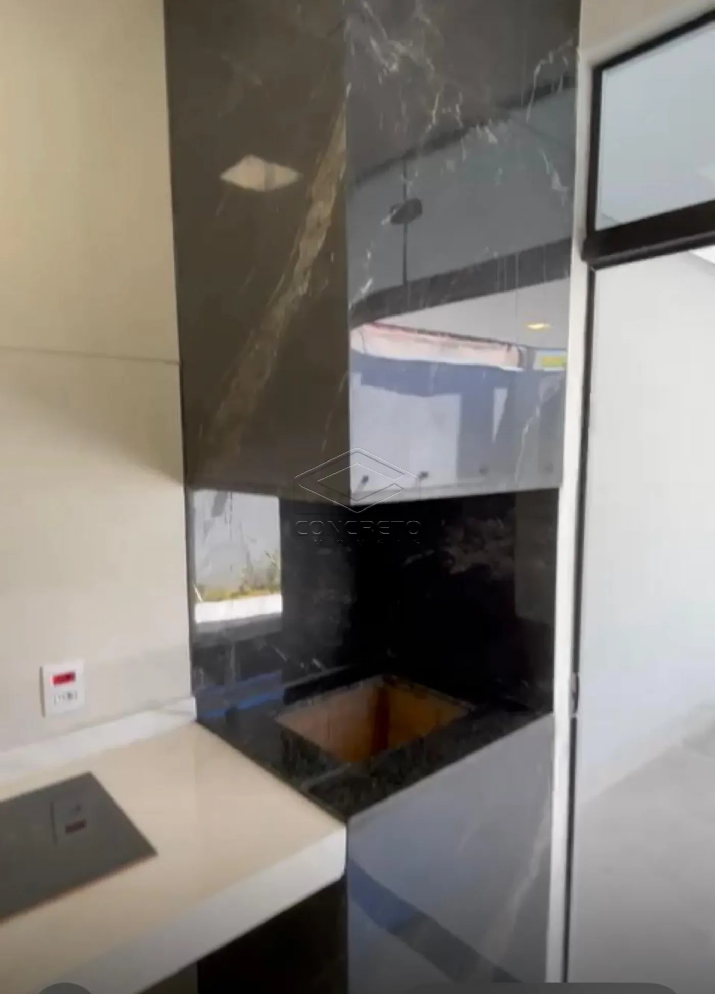 Cozinha grande integrada com área gourmet, bancada e churrasqueira revestidas em porcelanato;