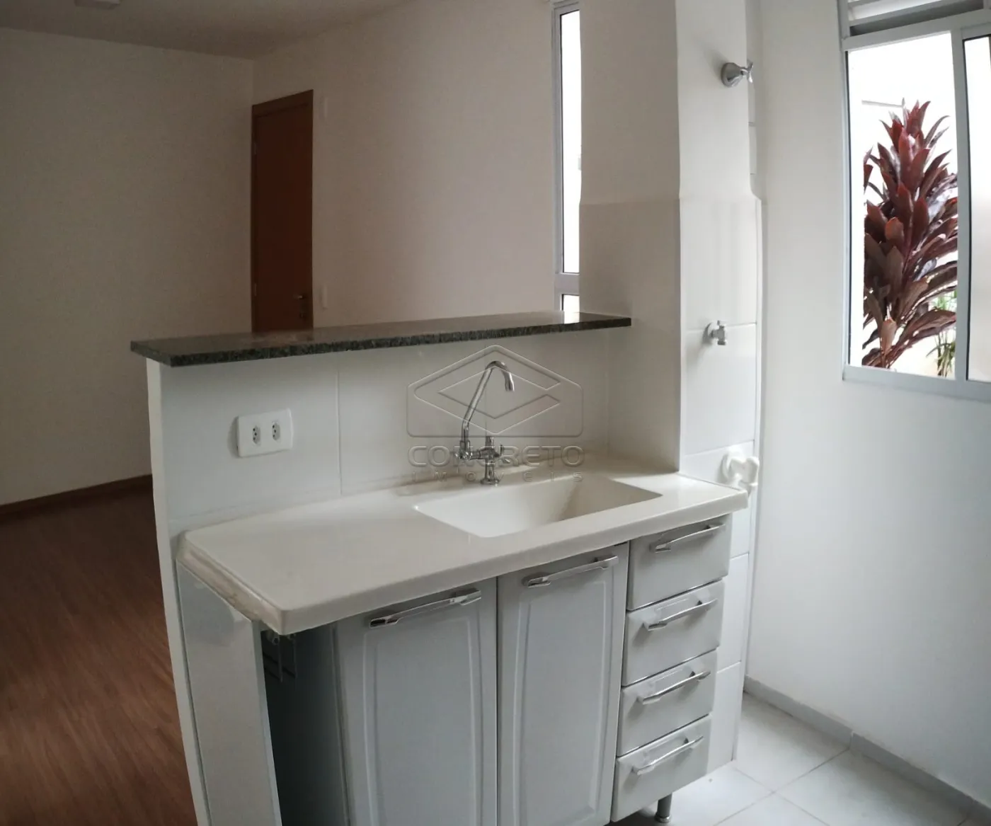 Apartamento de 40 m², distribuido em sala abiente aberto com cozinha, 02 dormitórios e banheiro social