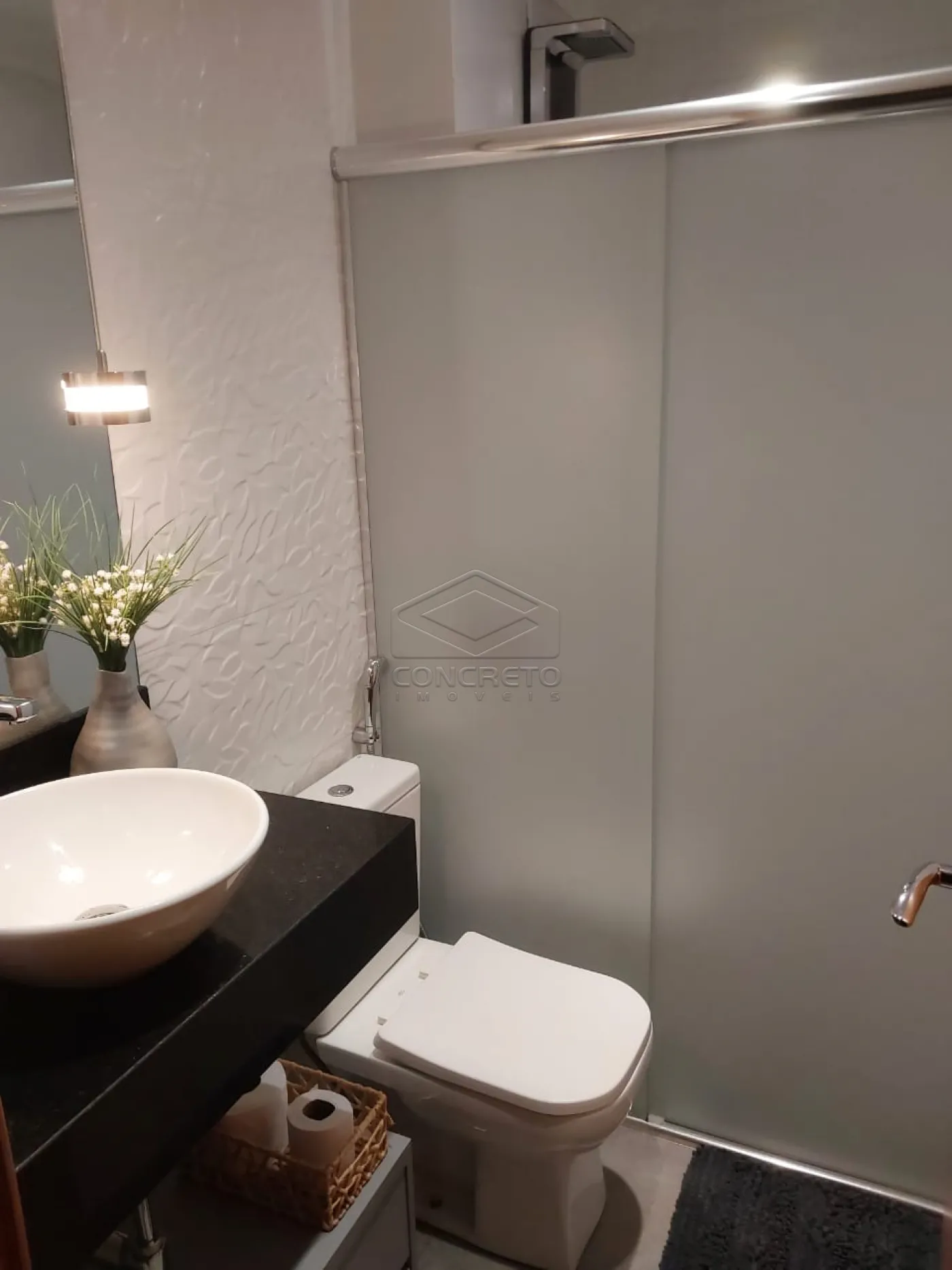 Quarto de casal, o roupeiro em `L` com 01 criado mudo (planejado) - Ventilador de teto no quarto de casal, banheiro com armário e espelho, box e chuveiro;